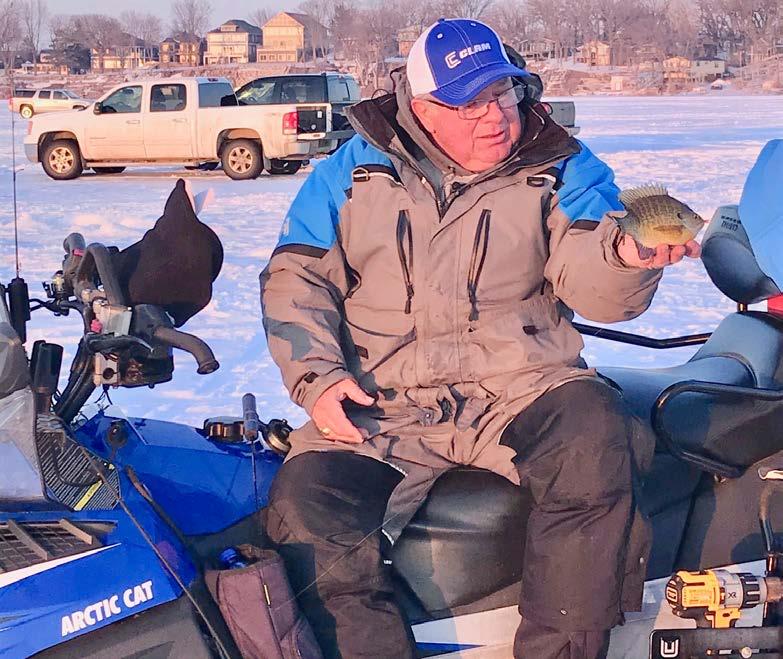 “They would use their money that they earned to go skating on Saturdays.” Kathy says looking back, “We were both honored to be a part of it!”Dave Genz catches a nice mid-winter West Okoboji bluegill. The Arctic Cat snowmobile offers Genz mobility to get from spot to spot. The Cat carries his Fish Trap, Vexilar, battery powered auger and all of his ice fishing equipment.