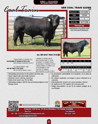 Domestic $50/Straw. 20 Straw Minimum. CSS Semen Available. Don Cox Tim Waldrop 281-395-1277 l cxcattle@brangusworld.com 601-624-1446 www.brangusworld.com 23