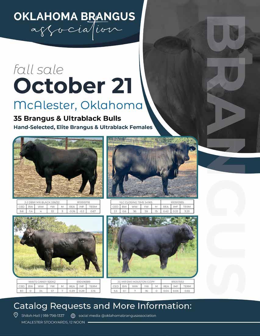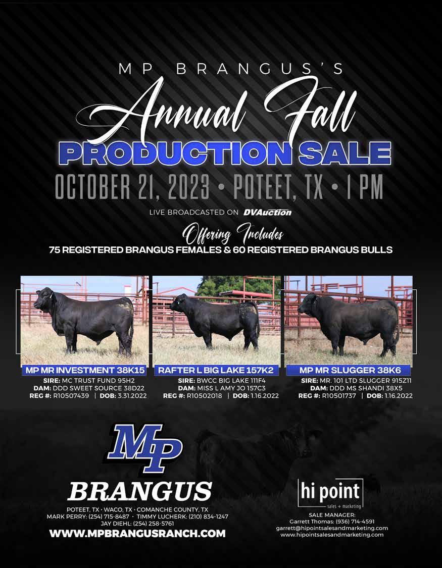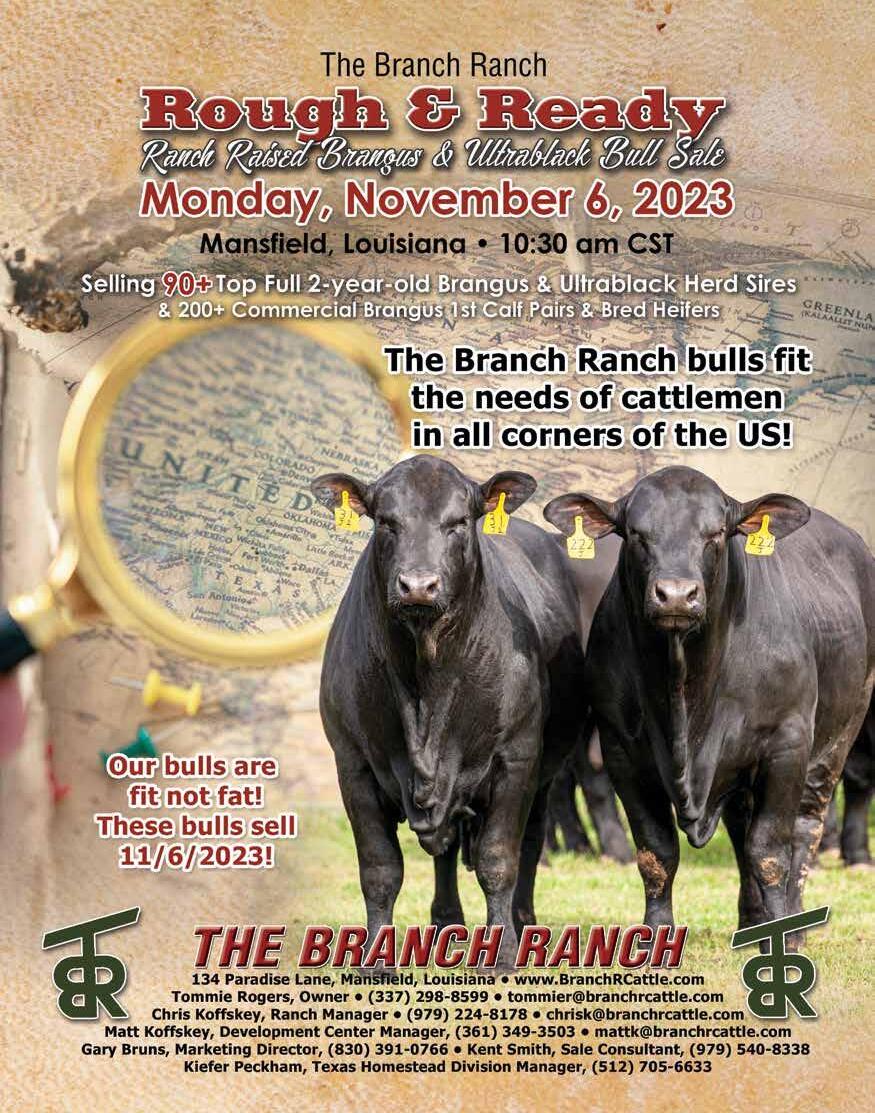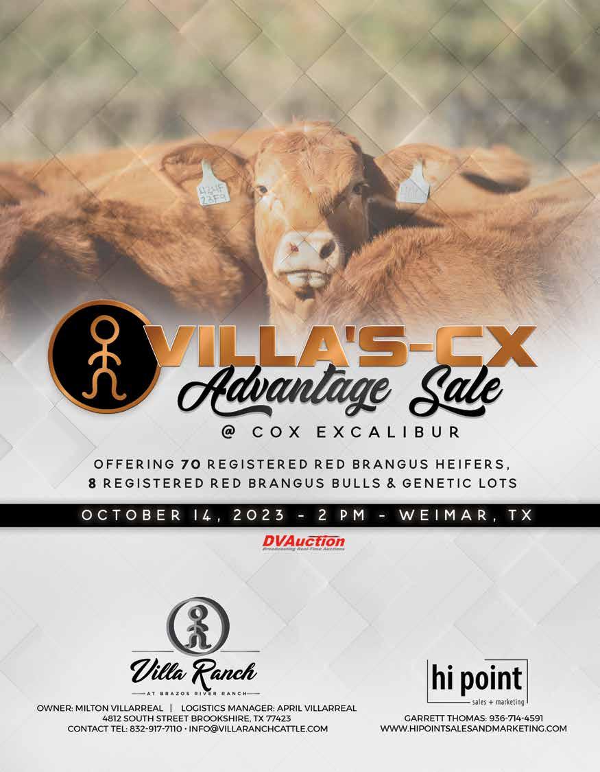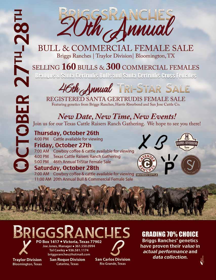 MARK COWAN 903-495-4522 • TODD HARVEY 386-288-8059 JUSTIN MATEJKA 903-521-1070 • JOE CAVENDER 903-571-1209 INFO@CAVENDERRANCHES.COM SCAN QR TO REQUEST A CATALOG OR VISIT CAVENDERRANCHES.COM OCTOBER 27-28, 2023 BRIGGS RANCHES - BLOOMINGTON, TX TRI-STAR BULL AND COMMERCIAL FEMALE SALE BRANGUS, UB & SANTA GERTRUDIS BULLS SAVE THE DATE! FRIDAY, NOVEMBER 17 COMMERCIAL FEMALE SALE – 12 PM REGISTERED FEMALE SALE – 5 PM DINNER TO FOLLOW SATURDAY, NOVEMBER 18 BULL SALE – 12 PM SCHEDULE OF EVENTS NOVEMBER 17-18, 2023 CAVENDER’S NECHES RIVER RANCH || JACKSONVILLE, TX 270 REGISTERED BULLS – BRANGUS, ULTRABLACK AND CHAROLAIS 80 REGISTERED FEMALES – BRANGUS AND ULTRABLACK 600 COMMERCIAL FEMALES – OPENS, BREDS AND PAIRS 19TH ANNUAL FALL PRODUCTION SALE