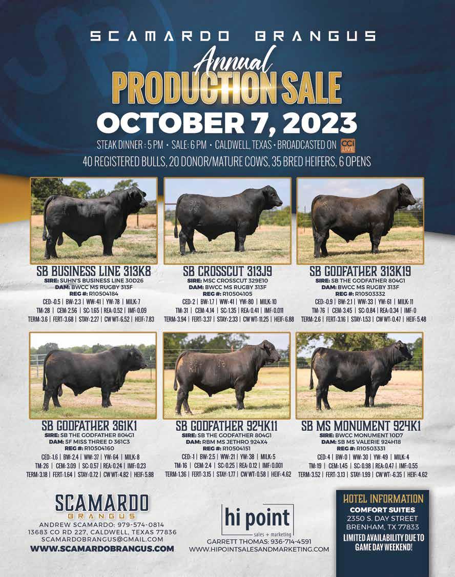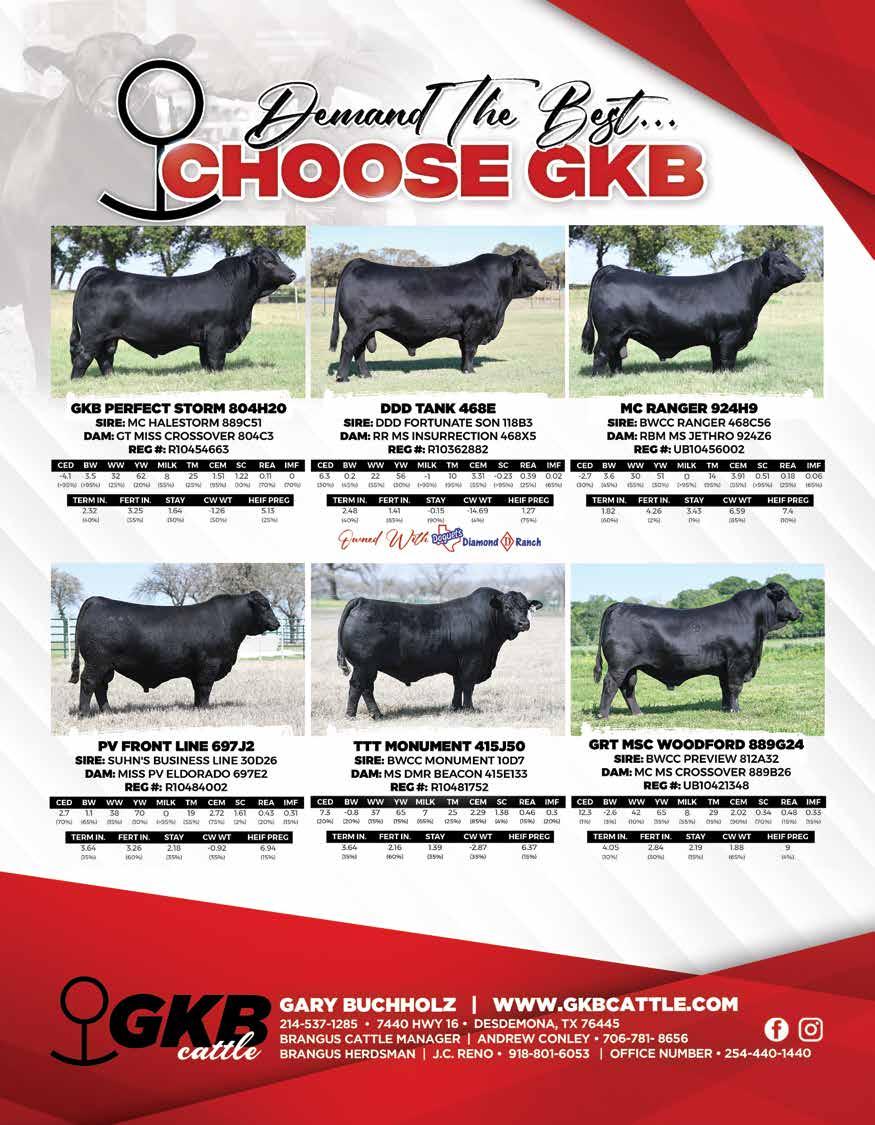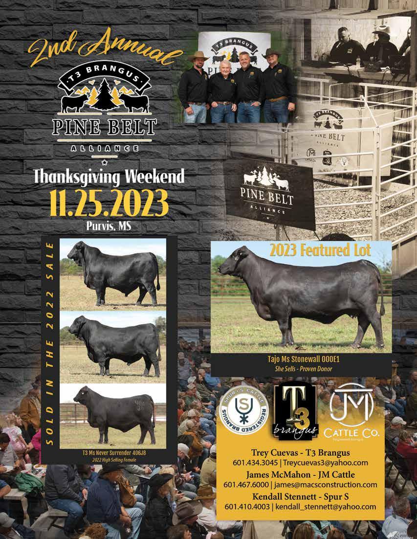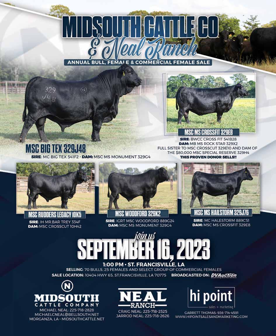 MARK COWAN 903-495-4522 • TODD HARVEY 386-288-8059 JUSTIN MATEJKA 903-521-1070 • JOE CAVENDER 903-571-1209 INFO@CAVENDERRANCHES.COM SCAN QR TO REQUEST A CATALOG OR VISIT CAVENDERRANCHES.COM OCTOBER 27-28, 2023 BRIGGS RANCHES - BLOOMINGTON, TX TRI-STAR BULL AND COMMERCIAL FEMALE SALE BRANGUS, UB & SANTA GERTRUDIS BULLS SAVE THE DATE! FRIDAY, NOVEMBER 17 COMMERCIAL FEMALE SALE – 12 PM REGISTERED FEMALE SALE – 5 PM DINNER TO FOLLOW SATURDAY, NOVEMBER 18 BULL SALE – 12 PM SCHEDULE OF EVENTS NOVEMBER 17-18, 2023 CAVENDER’S NECHES RIVER RANCH || JACKSONVILLE, TX 270 REGISTERED BULLS – BRANGUS, ULTRABLACK AND CHAROLAIS 80 REGISTERED FEMALES – BRANGUS AND ULTRABLACK 600 COMMERCIAL FEMALES – OPENS, BREDS AND PAIRS 19TH ANNUAL FALL PRODUCTION SALE
