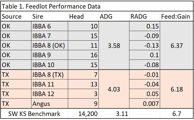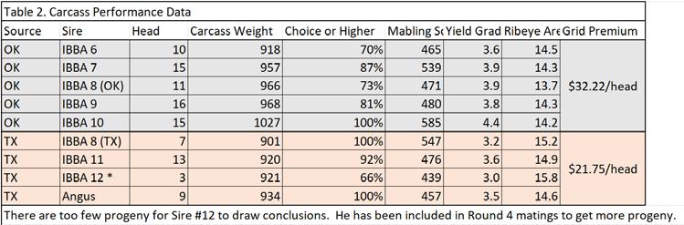 The average yield grade was 3.6. While this is very acceptable, we did end up with more yield grade 4’s than we would have liked. Since these were research cattle, they had to remain together through the entirety of the project in order to keep them in a perfect contemporary group and maintain the integrity of future EPD’s crafted from this data. Under normal conditions, the calves with more condition could have and would have been sorted off and harvested at an earlier endpoint. It should also be noted that the carcass weights found in the data table are unadjusted carcass weights, meaning that before they are incorporated into the IBBA genetic evaluation they will be adjusted to a standardized 28.7% empty body fat. The Oklahoma and Texas steers managed to rake in $32.22/head and $21.75/head premiums respectively over the live price when sold on a grid. It is not appropriate to compare carcass data from one cooperator group to another based on the simple averages presented in the table. The two cooperator herds are not genetically identical,