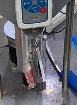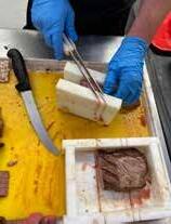 a restaurant. The strip loin steaks were cooked to a consistent internal temperature of 135 degrees and placed into a plastic cutting guide (pictured right). A graduate student used a special doublebladed knife to remove a slice from the steak where the muscle fibers were all running in the same direction. The steak slice was then placed onto a slice shear force machine (pictured left) where a dull metal blade cuts the steak slice in half perpendicular to the muscle fibers. As the machine cuts through the piece of steak, a sensor measures how many pounds of force it took to cut the steak slice in half, mimicking how much force it would take a person to chew it. Researchers have correlated slice shear