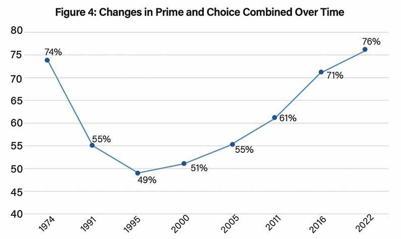 History is interesting, especially when one is old enough to have lived through some of it (like me). It surprises some folks to learn that the U.S. beef industry was producing almost 75% Choice and Prime beef in the mid-seventies. And then there was a 20-year slide in quality grade from 1975 to 1995, bottoming out at 49% Choice and Prime in 1995. What happened? In my opinion – genetic mismanagement (i.e. using genetics that do not fit the marketplace).