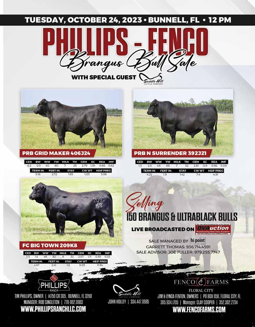 FENCO FARMS We Sell Cattle to Fit Your Needs JIM & LYNDA FENTON 305-934-1705 CLAY COOPER, MANAGER | 352-302-2734 P.O. BOX 658 FLORAL CITY, FL 34436 FENCO FARMS Mark Your Calendars PHILLIPS RANCH, FENCO FARMS AND SADDLE HILL CATTLE CO. WILL BE OFFERING 140 STOUT HERD SIRES AND RANGE BULLS TUESDAY, OCTOBER 24, 2023 FOR THE PHILLIPS-FENCO BULL SALE! CED 3.1 BW 1.3 WW 46 YW 83 M 8 TM 32 SC 1.11 REA 0.85 IMF 0.33 FERT 2.31 TERM 4.68 CEM 2.30 FAT 0.024 H PREG 11.92 STAY 1.72 COW WT -0.22 TRAIT EPD FC BIG TOWN 209K8 || REG. # R10525541