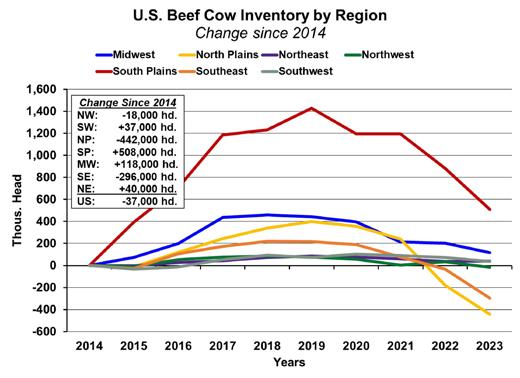 • U.S. cattle inventories have already fallen 1.5 million head from cycle highs. The 2023 beef cow herd is expected to be down about another million head to near 29.2 million.