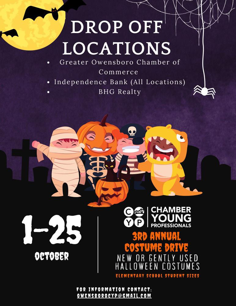 The Chamber Young Professionals will be accepting Halloween costume donations at the registration tables. Please bring new or gently used Halloween costumes. All costumes will be donated to local elementary school students. Reserve your spot now at www.chamber.owensboro.com or by calling the Chamber office at (270) 926-1860 by noon on Wednesday, October 4. COST IN ADVANCE: $15 for Chamber Members and $25 for non-members.