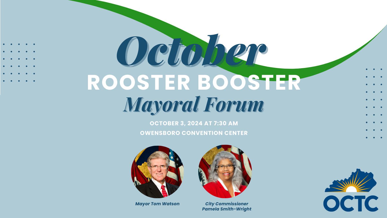 The Chamber will host its Rooster Booster breakfast this Thursday, October 3 at 7:30 a.m. at the Owensboro Convention Center (501 West Second Street). The program is sponsored by Owensboro Community and Technical College, and will include a Mayoral Forum featuring both of the Owensboro Mayoral Candidates for the upcoming General Election on Tuesday, November 5, 2024.
