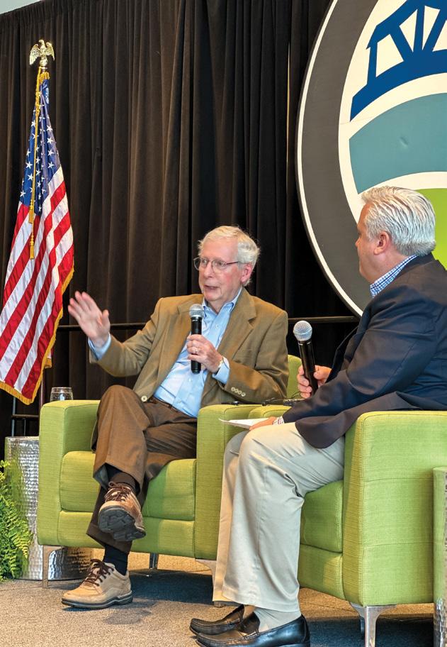 The Greater Owensboro Chamber of Commerce had the privilege of hosting a luncheon honoring United States Senator Republican Party Leader Mitch McConnell in Owensboro on August 28. The luncheon, sponsored by Owensboro Health, featured a fireside chat with Senator McConnell and Joe Arnold, Vice-President of Strategic Communications for Kentucky Living. The conversation afforded our community the opportunity to reminisce about key moments in Senator McConnell’s career and also to hear about the many important issues facing our country. A signature example of Leader McConnell’s transformational leadership for our region was the allocation of federal dollars that jump started the entire downtown project – a near $45 million allocation. That project has resulted in nearly 5:1 private – public investment dollars which has been the driving force in our economic development and talent retention/recruitment efforts. Thank you Senator McConnell for your continued service to our Commonwealth and our nation!