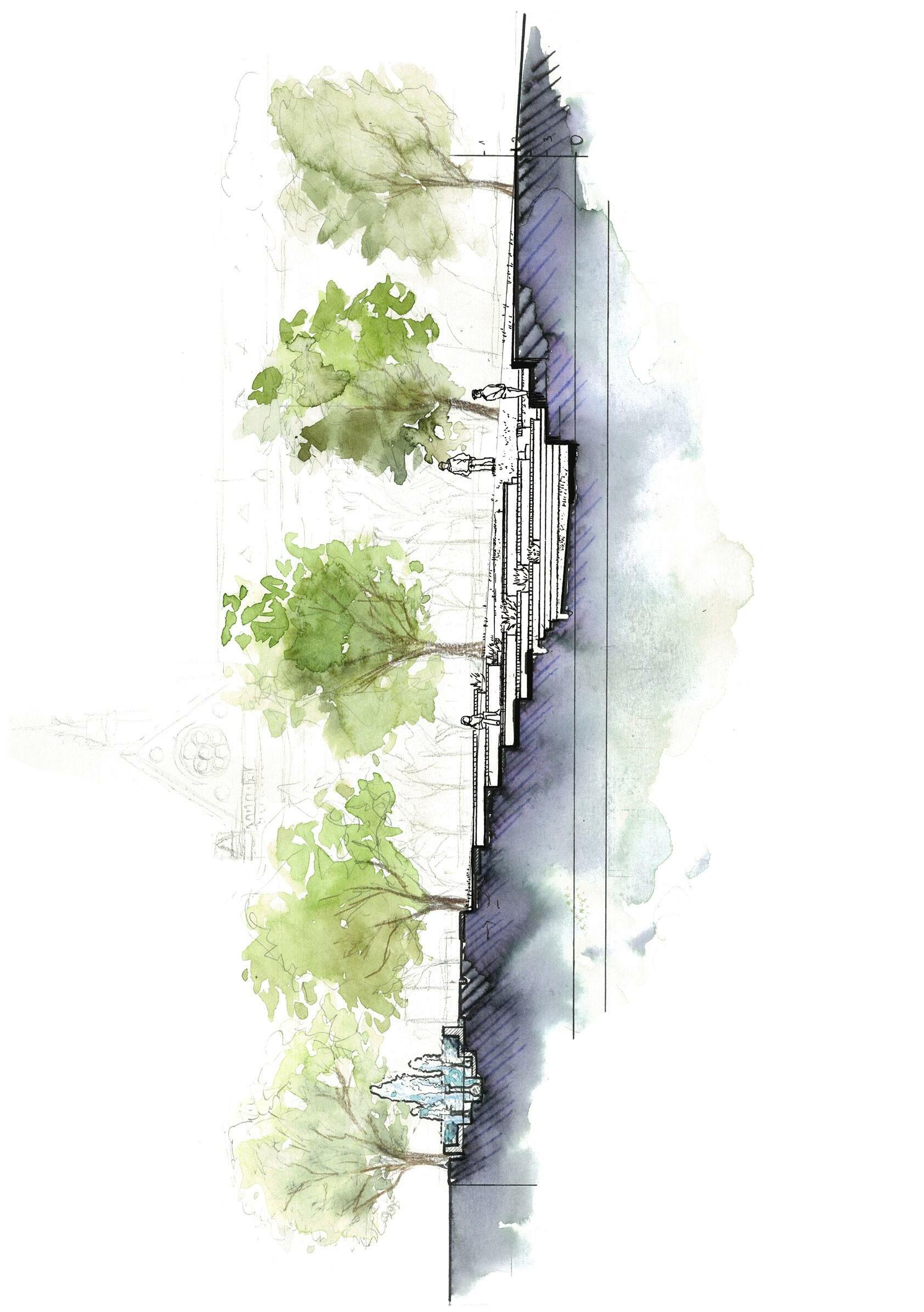 - Referred back to the artwork (1) where blue line imitates the water path and the pink one represents the seating area, I decided to take this concept (3)to the next level. A more detailed sketches combined with many ideas from precedents.