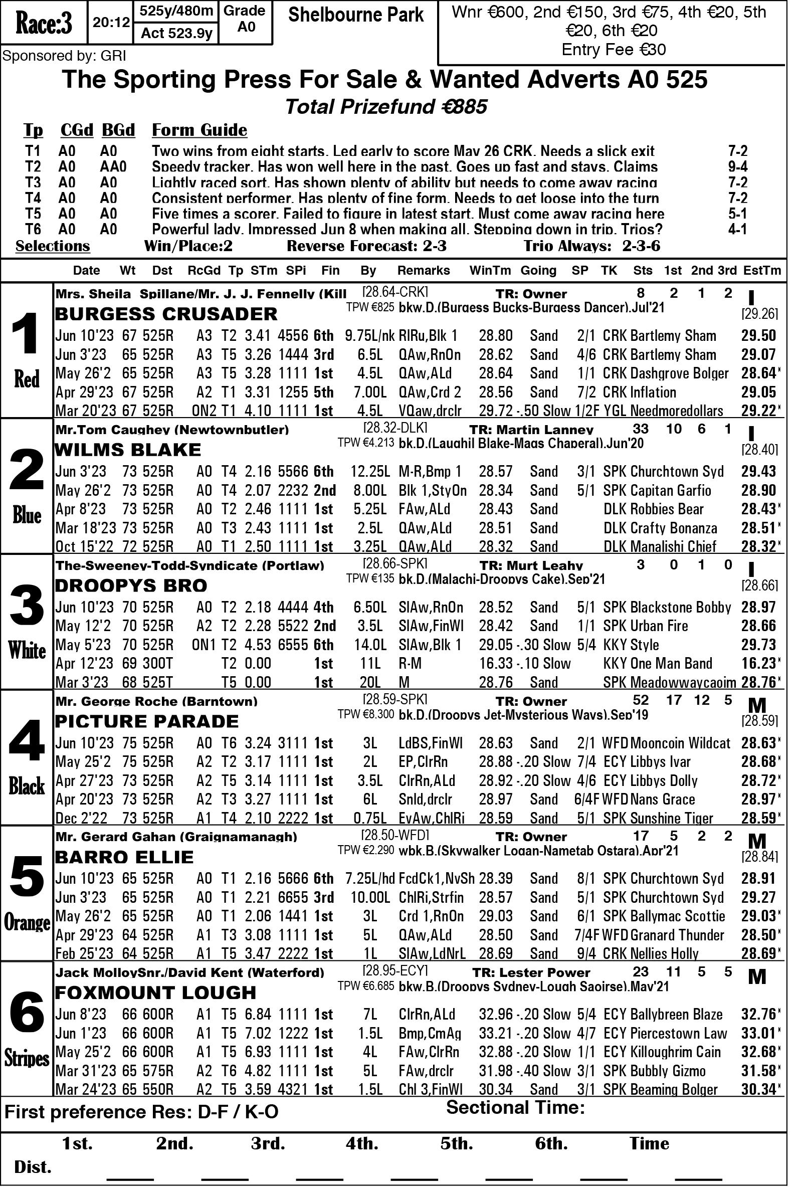 A3 (No Backgraders) 525 For 6 @ €20 Winner €400