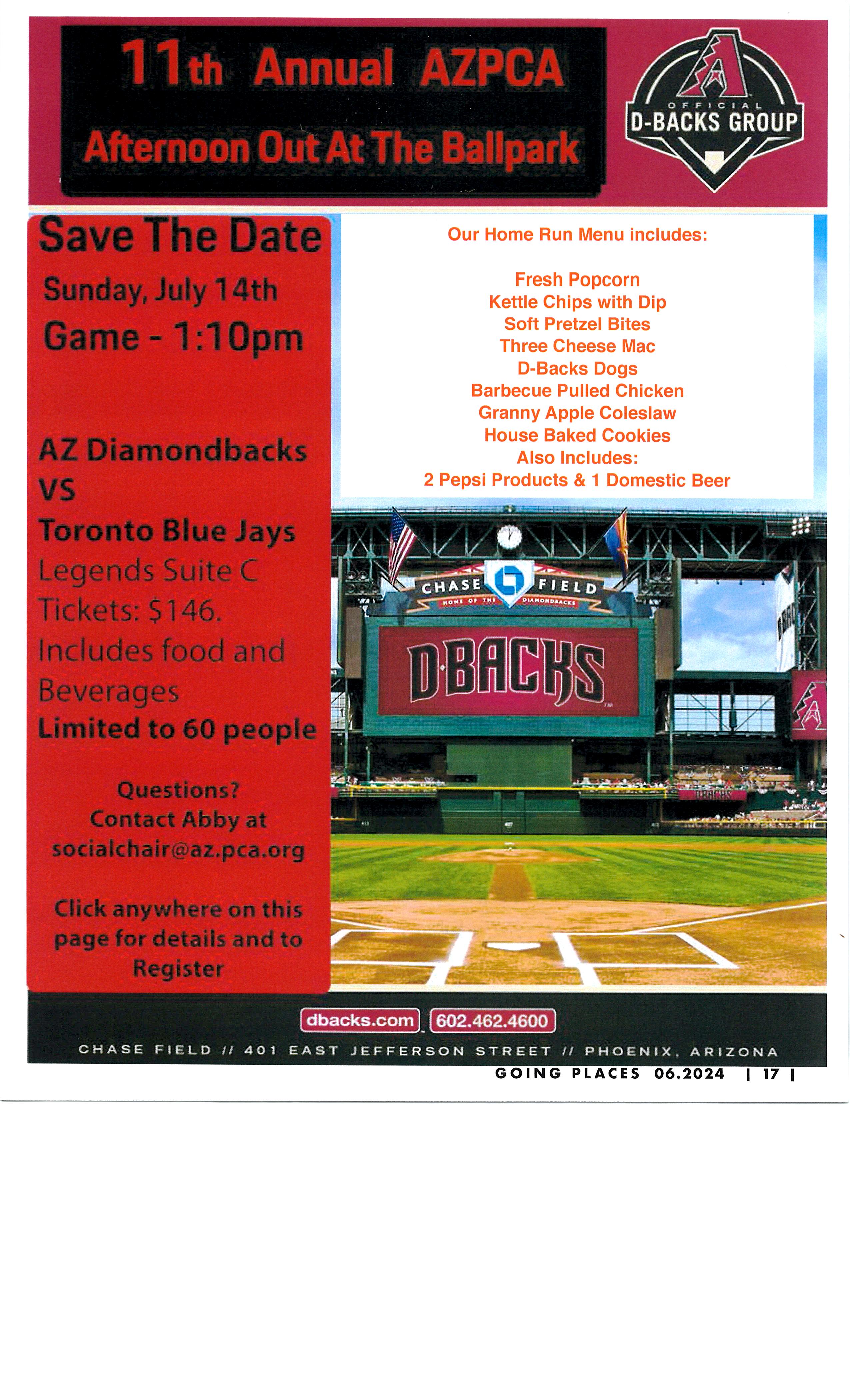 Last month, Abby Ercoline decided to step down as Social Chair. Thank you, Abby, for all your hard work as Social Chair. Abby is leaving the social calendar in great shape as she organized this year's Holiday Party for December 14th at Las Sendas in Mesa. Abby agreed to continue to handle the July 14th Afternoon at the Diamondbacks. The board agreed to do something special this year. Our members and guest have a special opportunity to root for the Diamondbacks in the "Legends Suite ". If you have never experienced watching a game in a suite you don't know what you are missing! The D-Backs are playing the Toronto Blue Jays. Your ticket includes food, drink, and 10 parking passes (distributed by lottery).