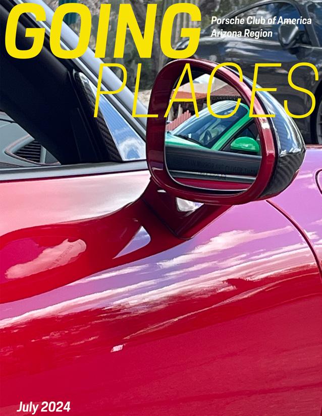 Written contributions and photographs are welcomed and can be emailed to the editor. Opinions expressed are those of the authors and do not necessarily represent the official position of the Porsche Club of America, Arizona Region, its officers or members. Permission is granted to reprint any material herein provided full credit is given to the author and to Going Places. PORSCHE®, the Porsche Crest®, CARRERA®, and TARGA® are trademarks of Porsche AG. The editor shall reserve the right to edit and publish only those articles felt to be in the best interest of the members of the Porsche Club of America. THE DEADLINE FOR ARTICLES AND ADVERTISEMENTS SUBMITTED FOR PUBLICATION IS THE 15TH OF THE MONTH PRIOR TO THE MONTH OF PUBLICATION. Commercial advertising rates can be found in the back of this publication.
