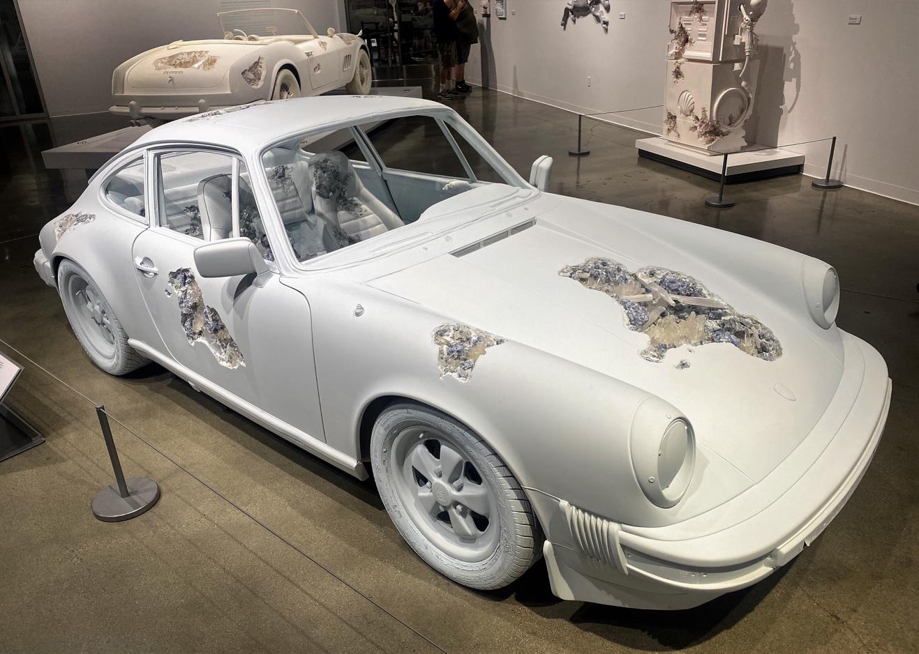 The 2022 Blue Calcite Eroded 911 was created by artist Daniel Arsham as a “Fictional Archeology” with materials listed as Fiberglass, Blue Calcite, Selenite and Hydrostone.