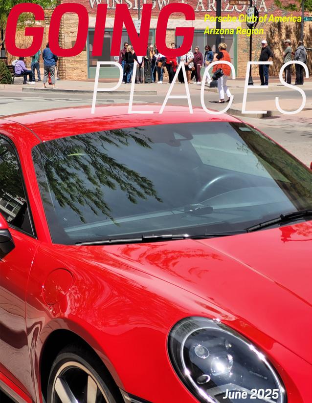 Rook Younger Going Places is the official publication of the Porsche Club of America, Arizona Region and is published electronically monthly. Written contributions and photographs are welcomed and can be emailed to the editor. Opinions expressed are those of the authors and do not necessarily represent the official position of the Porsche Club of America, Arizona Region, its officers or members. Permission is granted to reprint any material herein provided full credit is given to the author and to Going Places. PORSCHE®, the Porsche Crest®, CARRERA®, and TARGA® are trademarks of Porsche AG. The editor shall reserve the right to edit and publish only those articles felt to be in the best interest of the members of the Porsche Club of America. THE DEADLINE FOR ARTICLES AND ADVERTISEMENTS SUBMITTED FOR PUBLICATION IS THE 15TH OF THE MONTH PRIOR TO THE MONTH OF PUBLICATION. Commercial advertising rates can be found in the back of this publication.