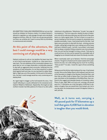 misfortune in the wilderness. “Adventures,” he said, “are a sign of incompetence.” This from a guy who, despite his years of experience and all his meticulous planning, was still forced to flee polar bears on a fairly regular basis. The fact is there is no way for a person heading out into the bush to prepare for absolutely every possible eventuality. I mean, I had trained hard for this hike. I had taken every precaution to deal with the heat—drinking volumes of water, eating high-energy food, even making sure all the heavy stuff was in Harland’s pack—but still, I succumbed. I only hoped that my always competent hiking companion was more prepared than me and had the foresight to bring a shovel. That way he could just bury me here and be spared the unenviable task of dragging my sun-bloated body back down this bloody mountain. When I eventually catch up to Harland, I find him annoyingly cheerful. Though he is flushed and his sweat-soaked shirt is plastered to his skin, he is still smiling way too much for my liking. “How ya doin’?” he asks. I resist the urge to throw something at him. Sitting around the kitchen table looking at the map, it had looked so easy. Drive up the Palliser River to the trailhead, park the truck at the boundary to Height of the Rockies Provincial Park, and then hike up Joffre Creek to Sylvan Pass. From there climb the pass, look down on the headwaters of the White River, then continue to the rugged and desolate beauty of Limestone Lakes. Piece of cake, right? Well, as it turns out, carrying a 45-pound pack for 17 kilometres up a trail that gains 4,438 feet in elevation is tougher than you would think. And trying to do it all in one day when the temperatures exceed 34 degrees Celsius is, well, just silly.