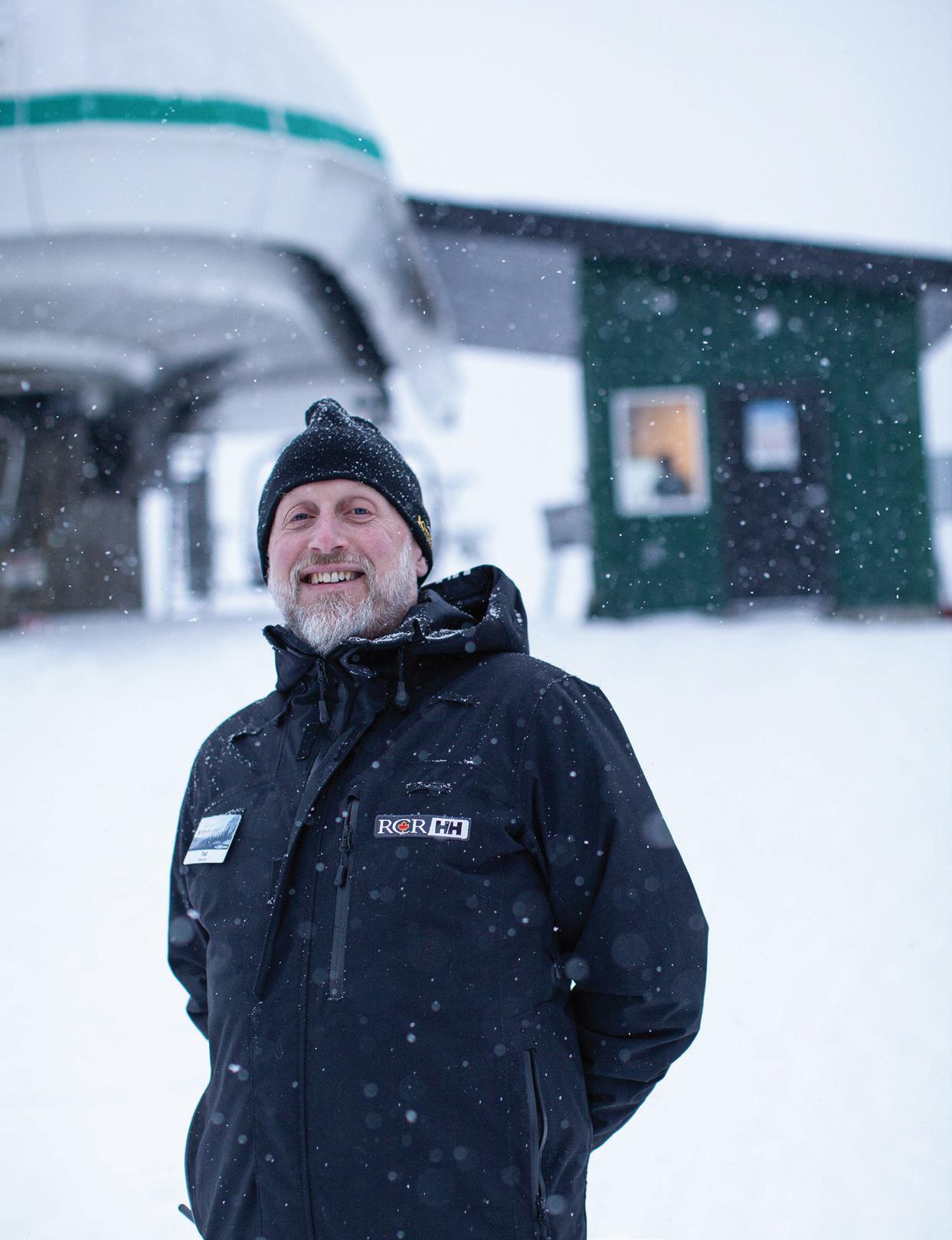 CONNER MOHNSSEN & FRIENDS SLEPT IN TENTS OVERNIGHT TO BE ON THE FIRST CHAIR, OPENING DAY | OPPOSITE PAGE: TED FUNSTON, GENERAL MANAGER AT KAR, IN FRONT OF THE NEWLY REBUILT LIFT OPERATIONS BUILDING | PHOTOS: JEFF PEW