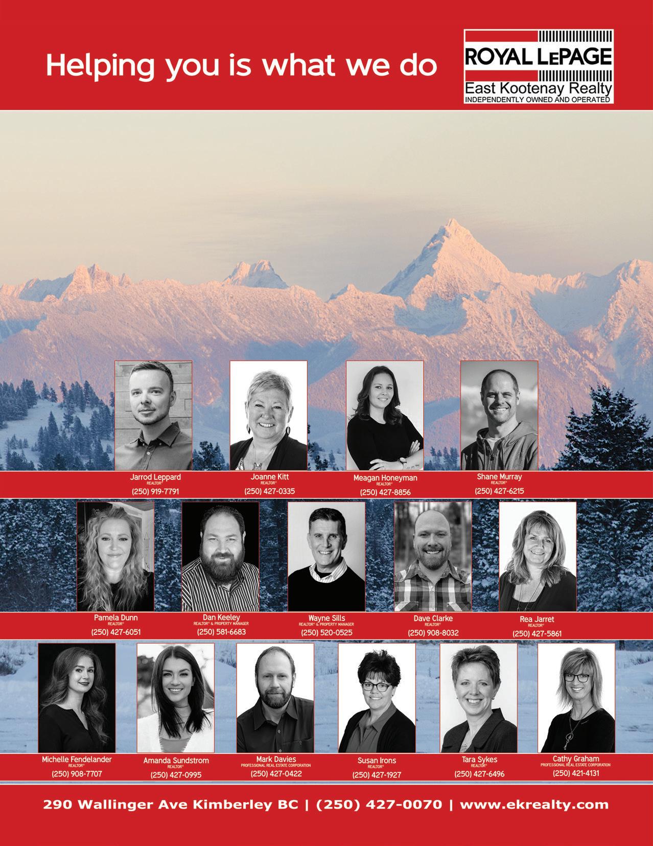 newdawndevelopments.com call 250.489. 1519 Come Build With Us SHOW H OME NOW OPEN Lickity Split Lickity Split DONAIRS • SUBS & WRAPS VEGAN OPTIONS • SUGAR FREE FOOTHILLS CREAMERY MAINSTREET MARYSVILLE • 250.919.5873 (ACROSS FROM THE FALLS) REAL ESTATE | FAMILY | PROBATE CONTRACT | CORPORATE | NOTARY Maggie Melnychuk & Michael Prestwich 250 427 2235 • WWW.ALPINELEGAL.CA • Kimberley, BC HOMEASSURE Your Key to Peace of Mind Professional Home Watch Services Kimberley BC HomeAssureHomeWatch.com (250 ) 90 8 -7335 National Home Watch Association Accredited • Home Watch. Maintenance. Concierge 50,000 eyes are nothing to sniff at. That’s a lot of people! It means that every year the combined populations of Kimberley and Cranbrook will see this magazine. Wouldn’t it be great if they were looking at your business too? Our new directory format gives each ad enough space to stand out and ensures that your business has a consistent presence in each issue for the entire year. Our design team will help build it, and the price will probably surprise you. Send us an email or give us a call to find out more. NEW BUSINESS DIRECTORY 50,000 eyes are looking for you. Better exposure, no hassle. Lodging & Transportation. Made Simple. Kimberley.com Rachelle Langlois, CHS™ 778-481-5258 rachelle.langlois@sunlife.com 312 304th Street Kimberley, BC V1A 3H3 Mutual funds distributed by Sun Life Financial Investment Services (Canada) Inc. Sun Life Assurance Company of Canada is a member of the Sun Life Financial group of companies. © Sun Life Assurance Company of Canada, 2018. THIS IS HEALTH. THIS IS WEALTH. Let’s discover yours