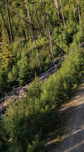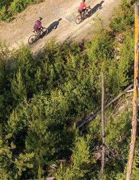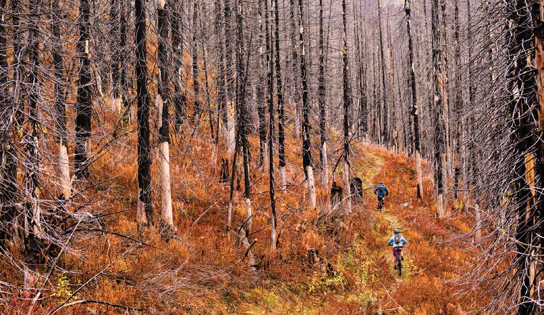 Feel the burn Riders Christine Wallace and Tony Braun ascend into ravaged and remarkable timbers above St. Mary Lake, B.C. on the trail to Haystack Lakes. Check out Electric Circus , page 68, for more on the oncoming e-bike revolution. — Bruno Long Photo