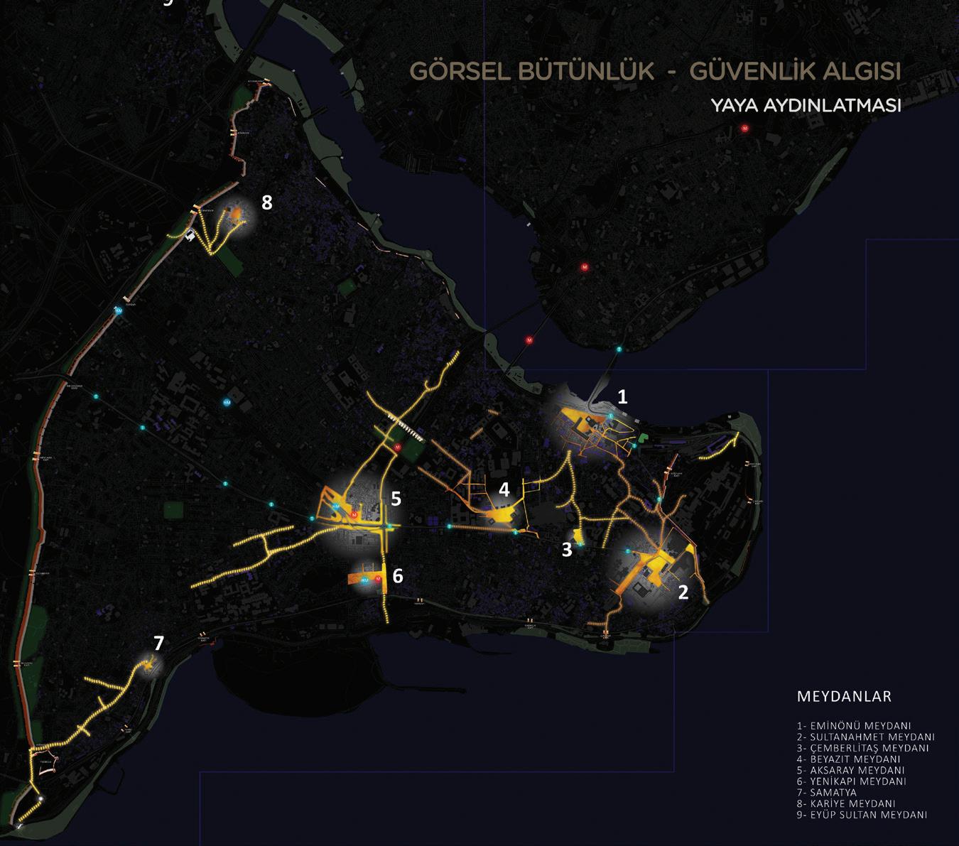 Nightime flow - static activities 30 Figure 69: Sun path of the location of the building 31 Figure 70: Hourly Weather Data for İstanbul 31 Figure 71: Solar Radiation Analysis Source: Climate Studio) 32 Figure 72: Comparison of the Annual Sunlight Exposure Source: Climate Studio) 32 Figure 73: Pictures from the site showing the current artificial lighting 33 Figure 74: Courtyard 34 Figure 75: Landscaping 34 Figure 76: Landscaping on square 34 Figure 77: Reflection on the floors of building block 34 Figure 78: Materials of the artworks (Source: imcsanat.msgsu.edu.tr) 35 Figure 79: Locations of the artworks (Source of the original plan: saltresearch.org) 35 Figure 80: Renders of the urban project of İstanbul Metropolitan Municipality (Source: İstanbul Metropolitan Municipality) 36 Figure 81: İstanbul Lighting Master Plan showing selected zones (Source: İstanbul Metropolitan Municipality) 37 Figure 82: Sections showing the comparison between current situation and design proposal (Source: İstanbul Metropolitan Municipality 37 Figure 83: Street Hierarchy (Source: İstanbul Metropolitan Municipality) 38 Figure 84: Sub-regions for İstanbul