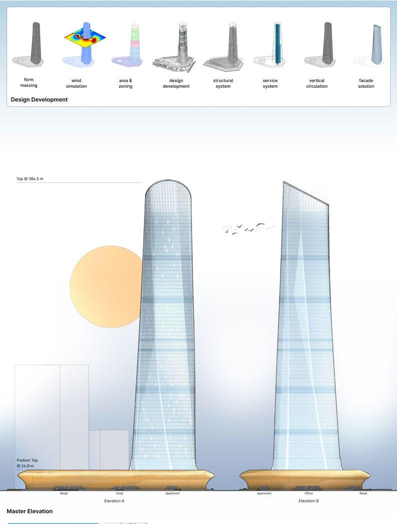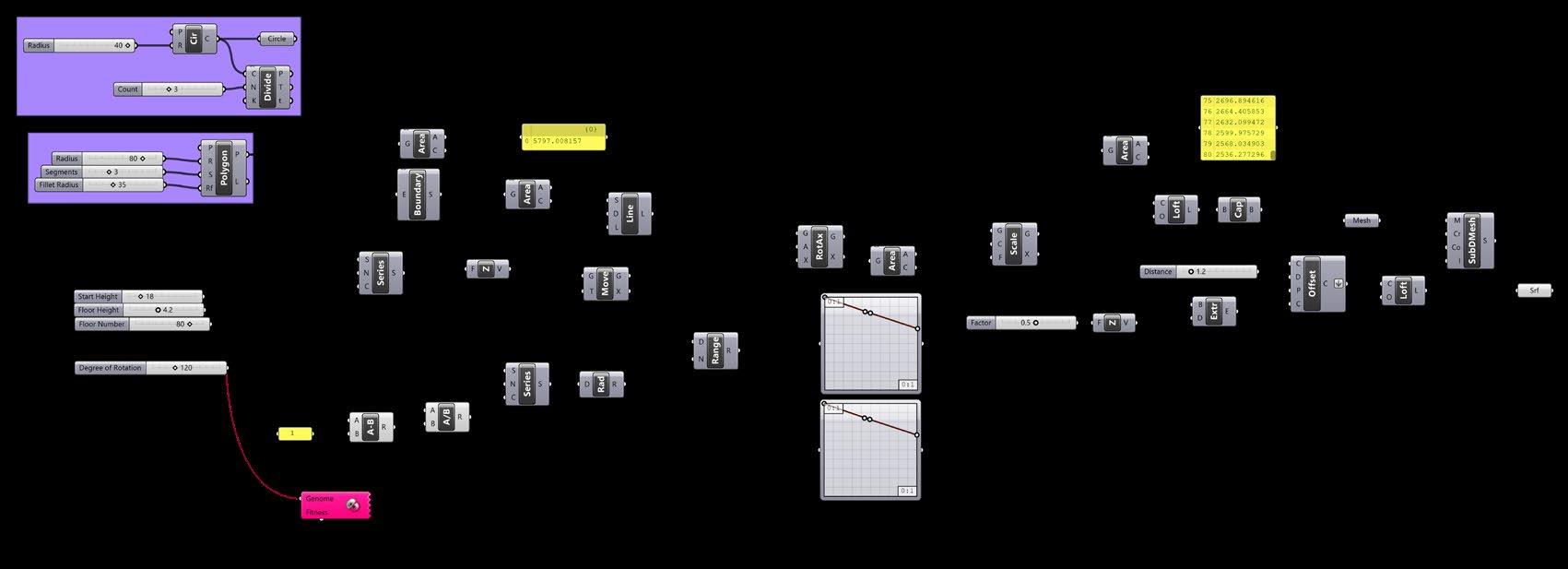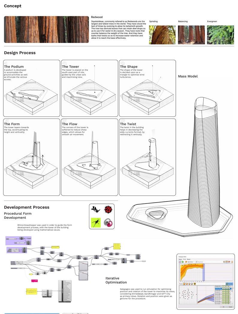 Rhino+Grasshopper was used in order to guide the form development processm with the tower of the building being developed using geometric parameters with control over its shape, curvature, rotation, taper and twist. It was further put through several iteration to optimise the views through galapagos.