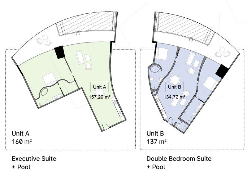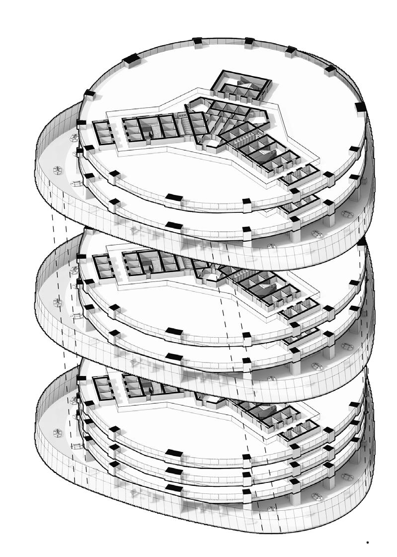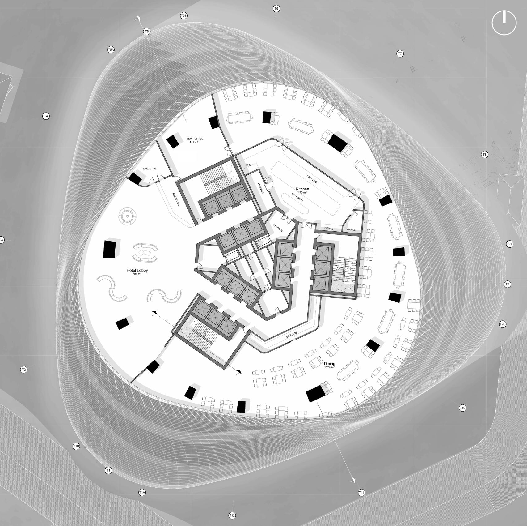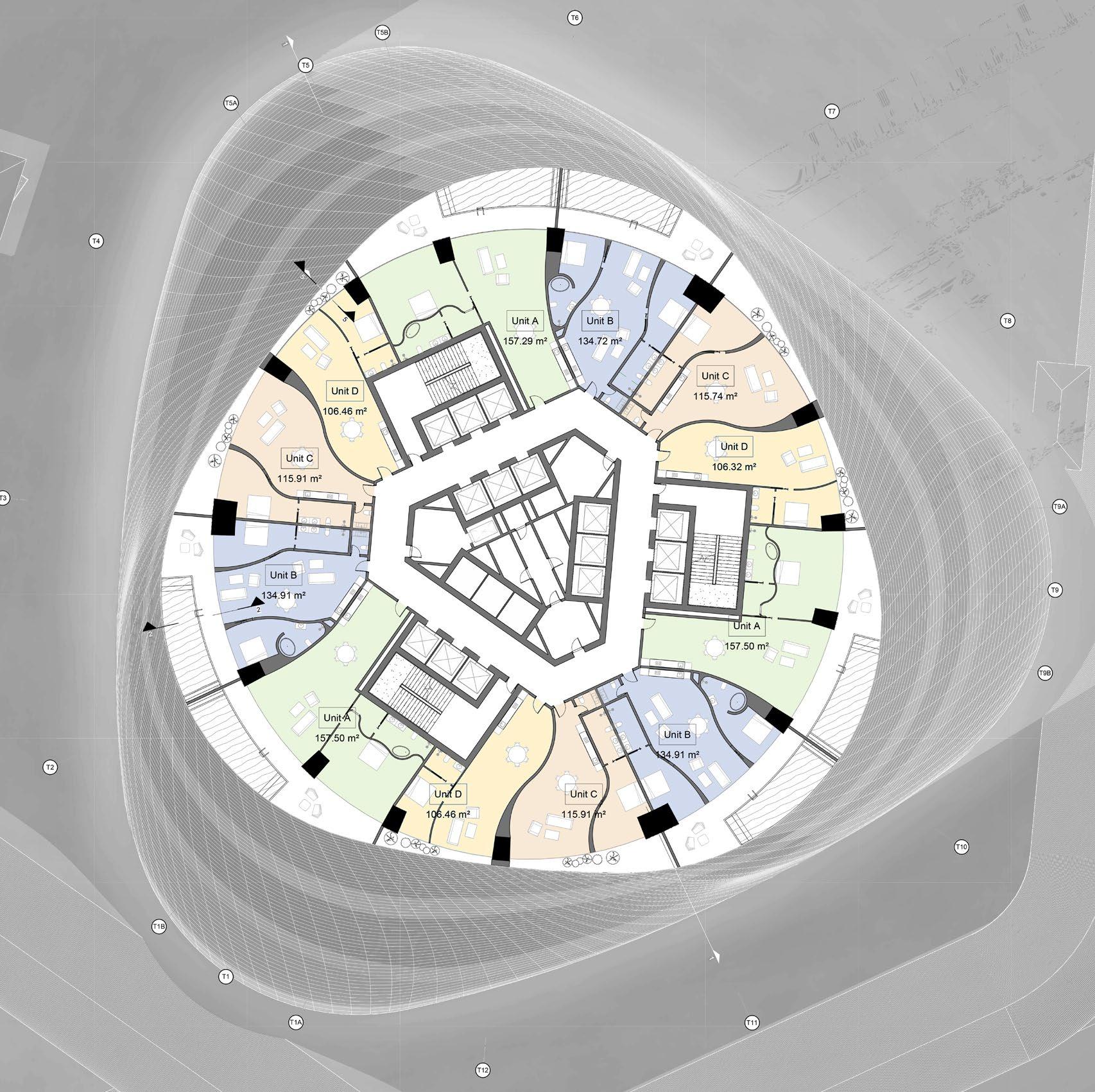 Rhino+Grasshopper was used in order to guide the form development processm with the tower of the building being developed using geometric parameters with control over its shape, curvature, rotation, taper and twist. It was further put through several iteration to optimise the views through galapagos.