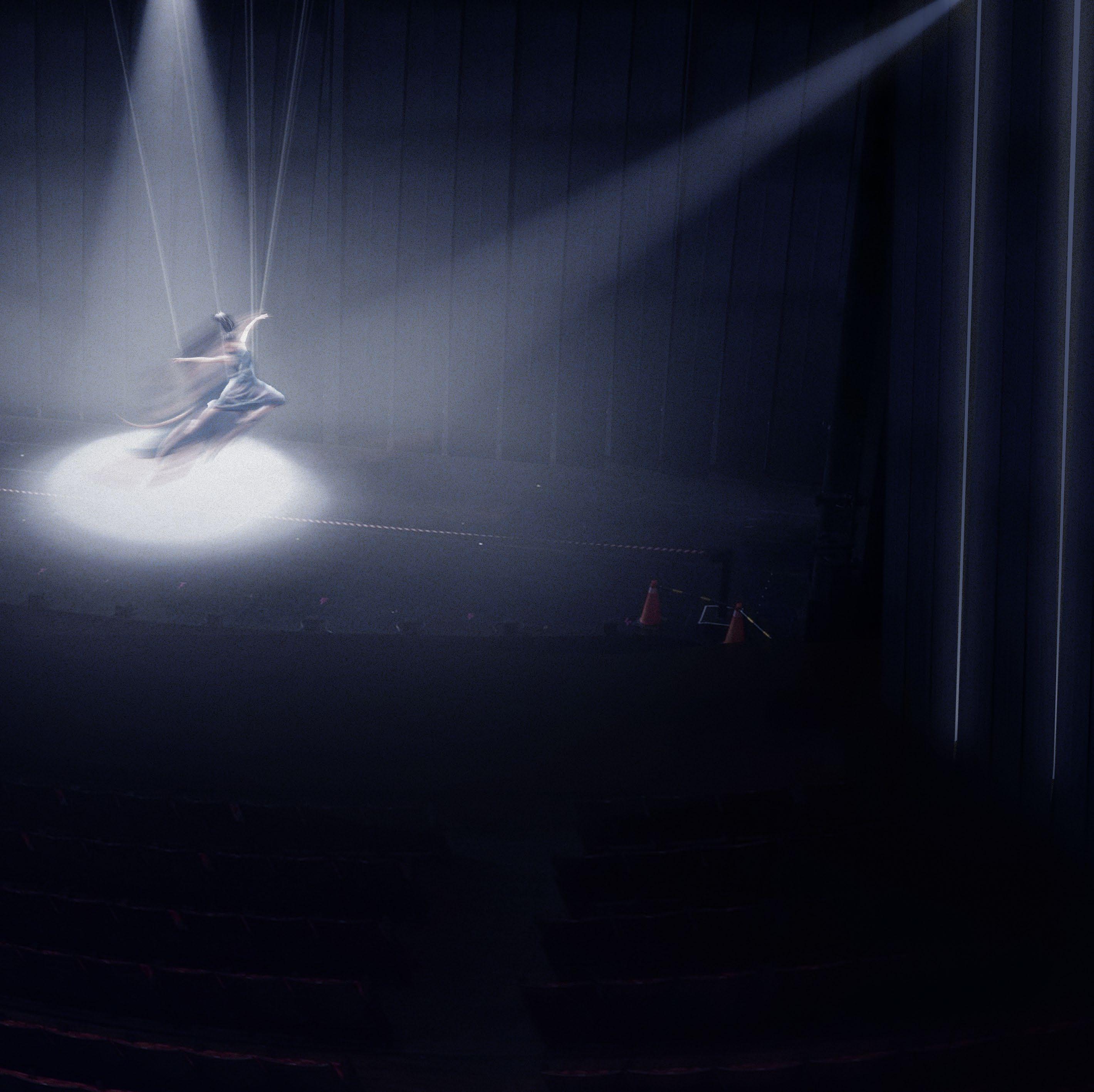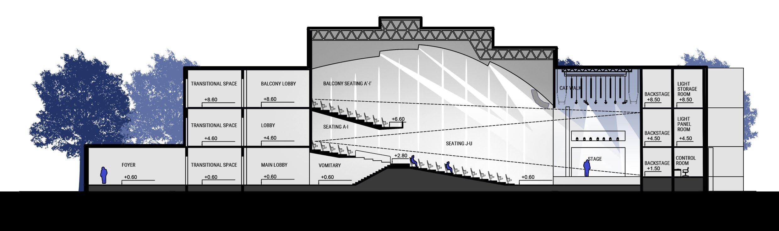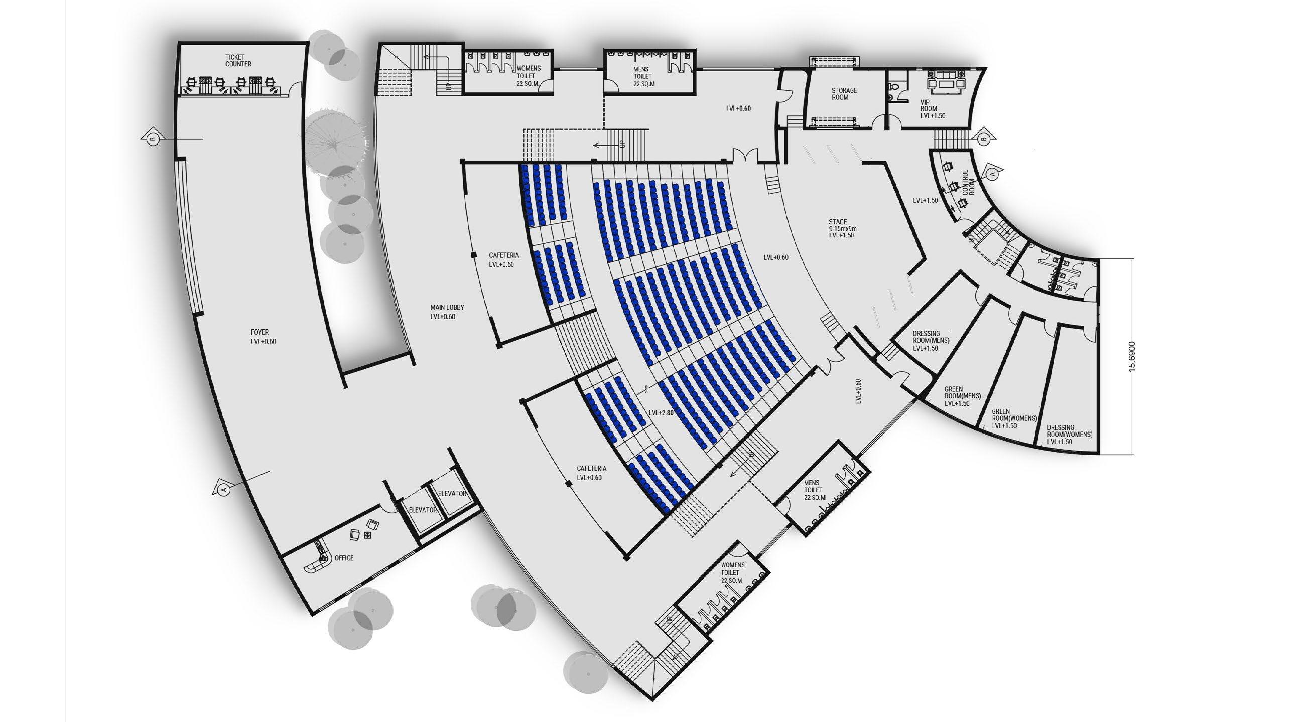 Additional spaces like backstage area, lobby, corridor, cafeteria