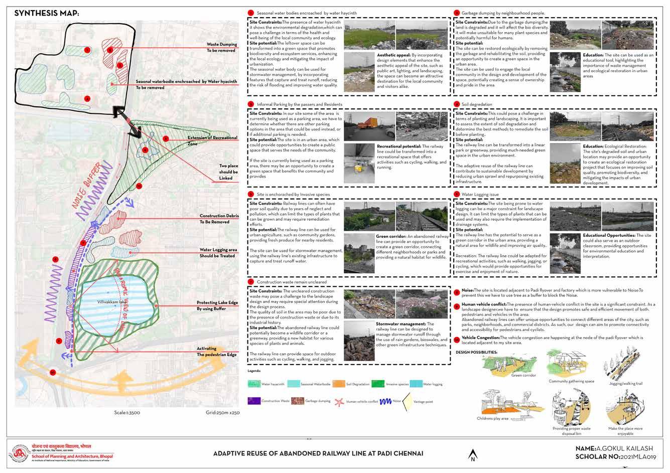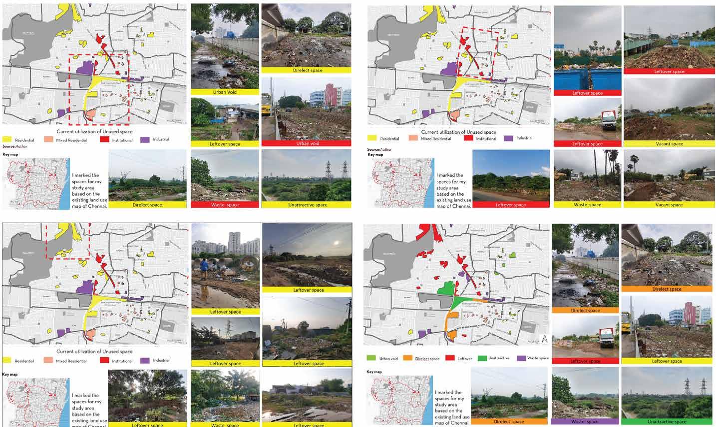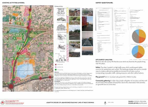 To address this issue, there is a growing need to prioritize the development and preservation of open spaces in Chennai. These initiatives aim to provide opportunities for recreational activities, promote physical and mental health, foster community engagement, and contribute to the overall sustainable development of the city. Recognizing the critical significance of open spaces in enhancing the well-being and quality of life for Chennai’s residents, efforts are underway to explore innovative approaches, such as adaptive reuse and revitalization of underutilized spaces, to create more accessible and inclusive open spaces. By focusing on the improvement and expansion of open spaces, Chennai can strive towards becoming a more livable and resilient city, where residents can enjoy a better quality of life, reconnect with nature, and foster a strong sense of community. The need for study is to address the lack of open spaces in Chennai and explore the potential of utilizing leftover spaces in the city. The study aims to understand the different types of leftover spaces, the challenges associated with working with them, and identify ways to repurpose these spaces effectively. By examining the concept of adaptive reuse instead of open space, the study seeks to provide innovative solutions to enhance the quality of life in Chenna How can the abandoned railway line in Chennai be adaptively reused to create functional and vibrant spaces that cater to the needs of the community and contribute to the city’s sustainable development? Negative or leftover spaces are thus part of the urban fabric of cities across the world. Chennai is the fourth largest metropolitan area in India, with a population of 7 million in 2001. Located in State of Tamil Nadu, Chennai is the major city of southern India. Chennai is the fourth largest metropolitan area in India, with a population of 7 million in 2001. Located in State of Tamil Nadu, Chennai is the major city of southern India Between 2015 and 2018, the Chennai Metropolitan Development Authority (CMDA) swallowed up as many as 11 open spaces in Chennai for converting into residential and commercial projects. The United Nations Human Settlements Programme dictates that for every