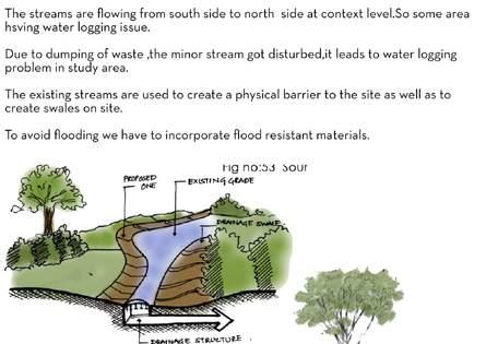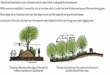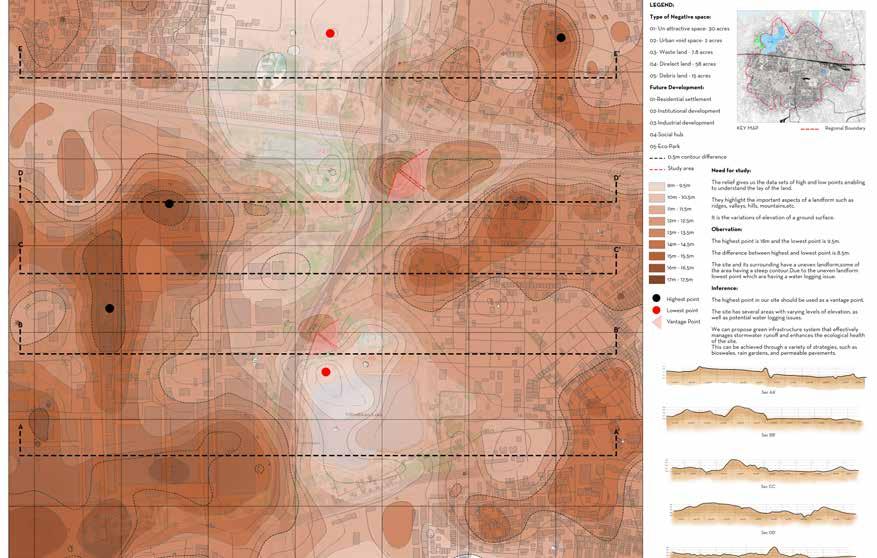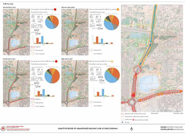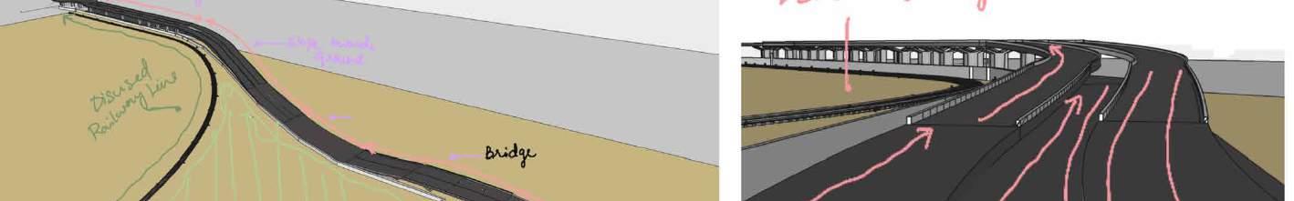 The overall site analysis of the abandoned railway line reveals a rich tapestry of characteristics and opportunities that lay the foundation for its adaptive reuse. The analysis encompasses various aspects, including the existing landform, landscape character, visual qualities, activities, traffic flow, and user preferences. The existing landform showcases undulating hills, a meandering river, rock formations, and open plains, offering diverse topography and scenic beauty. The landscape character highlights the presence of overgrown vegetation, decaying infrastructure, and diverse land uses along the railway line. Visual analysis unveils captivating visual elements, including light and shadow dynamics, urban-natural juxtapositions, and panoramic views. The existing activities study uncovers a range of human interactions, from urban exploration to artistic expressions, indicating the site’s cultural potential. The traffic flow map provides insights into transportation connectivity and opportunities for integration with the surrounding network. Lastly, the user analysis delves into user preferences, desires, and activities, shaping the design approach. The comprehensive site analysis serves as a critical framework, guiding the adaptive reuse project to harness the site’s unique attributes, address challenges, and capitalize on opportunities. By integrating these findings into the design process, the adaptive reuse of the abandoned railway line can be realized as a vibrant, sustainable, and communitycentric space that celebrates heritage, fosters connectivity, and enriches the lives of its users. The overall site analysis of the abandoned railway line presents a holistic understanding of its potential for adaptive reuse. Through a comprehensive assessment of various aspects, including the existing landform, landscape character, visual qualities, activities, traffic flow, and user preferences, a nuanced portrait of the site emerges. The examination of the landform reveals a captivating mix of undulating hills, meandering water bodies, rock outcrops, and vast open plains. These natural features offer not only visual interest but also opportunities for diverse programming, such as elevated viewpoints, waterfront activities, and recreational spaces.