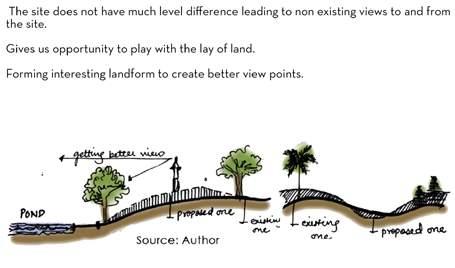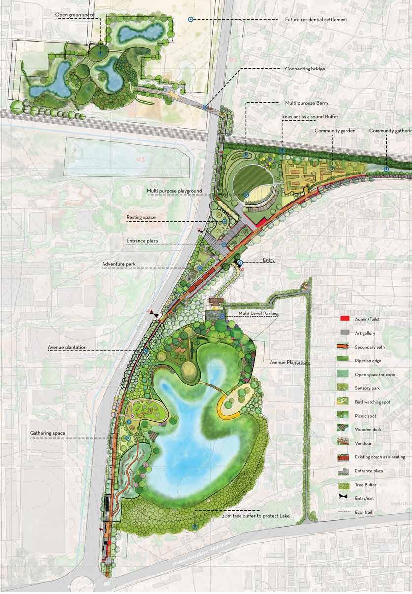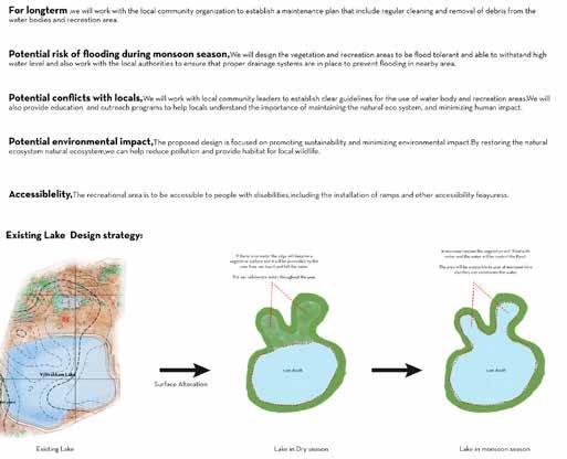 Altered Surface Design: Describe the alteration of the lake’s surface, as previously mentioned, to enhance its functionality and aesthetic appeal. Ensure that the altered surface design takes into consideration the integration of the picnic spot, creating suitable areas for seating, activities, and interactions with the lake. Soft Edge Design, Bird Watching Spot, and Picnic Spot: Implement a soft edge design approach along the lake’s perimeter, integrating the bird watching spot and the designated picnic area. Use naturalistic and gentle slopes to seamlessly blend the lake with the surrounding landscape. Provide suitable seating, tables, and facilities in the picnic spot to accommodate visitors and enhance their enjoyment of the area. Non-Mechanical Boating and Rowing Boat Rentals: Continue to emphasize non-mechanical boating activities, specifically the use of old rowing boats, to offer visitors a peaceful and environmentally friendly way to explore the lake. Ensure that the boating activities do not interfere with the picnic spot, providing appropriate pathways or separations between these areas. Plant Buffer Zone and Native Vegetation: Maintain the 30-meter plant buffer zone around the lake, incorporating native plant species to stabilize the shoreline and create a natural transition. Consider the use of trees, shrubs, and grasses that can provide shade and enhance the picnic spot’s ambiance, while promoting biodiversity and environmental sustainability. In conclusion, the adaptive reuse of the abandoned railway line holds immense potential for transforming a neglected and forgotten space into a vibrant, culturally rich, and socially engaging asset within the community. The thorough site analysis, encompassing the existing landform, landscape character, visual qualities, activities, traffic flow, and user preferences, has provided valuable insights that inform the adaptive reuse design. The existing landform offers a diverse topography, presenting opportunities for varied programming and recreational activities. The landscape character highlights the site’s unique blend of natural elements and decaying infrastructure, setting the stage for repurposing and revitalization. The visual analysis has uncovered captivating visual elements, offering inspiration for design interventions that celebrate the site’s inherent beauty and historical significance. Furthermore, the analysis of existing activities and user preferences underscores the importance of community engagement and inclusivity in the adaptive reuse project. By incorporating and enhancing these activities, the project can foster a sense of place and ownership among the community, ensuring its long-term sustainability. Considering the traffic flow and transportation connectivity, the project can optimize accessibility and promote sustainable modes of transportation. In light of these findings, it is recommended that the adaptive reuse design integrates cultural and artistic spaces, recreational amenities, and multimodal transportation infrastructure, all while preserving the site’s unique heritage. Mechanical removal of water hyacinth: Schedule regular mechanical removal of water hyacinth from the water bodies using boats or other equipment. Shoreline restoration: Restore the natural vegetation along the shoreline of the water bodies by planting native species of trees, shrubs, and grasses. Use species that are well adapted to the local climatic conditions, such as Palmyra palm (Borassus flabellifer), Neem (Azadirachta indica), Indian gooseberry (Emblica officinalis), and Indian almond (Terminalia catappa). These plants will not only help stabilize the soil and prevent erosion but will also attract local wildlife to the area. By embracing the site’s existing qualities and engaging with the community, the adaptive reuse project can serve as a catalyst for social interaction, cultural enrichment, and sustainable development. The site’s unique characteristics, including the diverse landform, captivating landscape character, intriguing visual qualities, and existing activities, present a wealth of opportunities for repurposing and revitalization. The integration of the existing landform, such as the undulating hills, riverine features, and open plains, can inform the design of diverse recreational and leisure spaces that harmoniously blend with the natural surroundings. The preservation and thoughtful incorporation of the landscape character, including the overgrown vegetation and decaying infrastructure, can not only honor the site’s historical significance but also serve as artistic and cultural elements that celebrate its past while embracing the present.