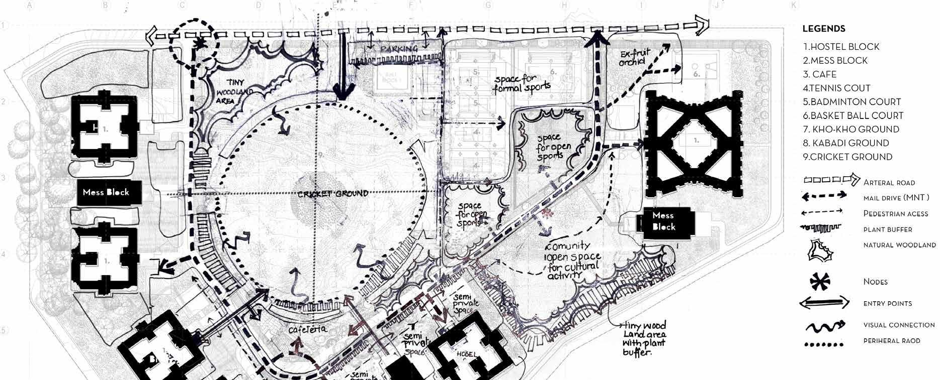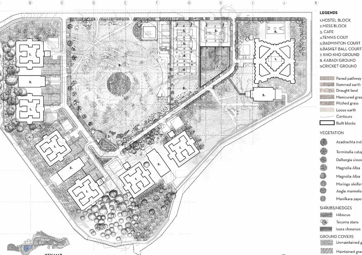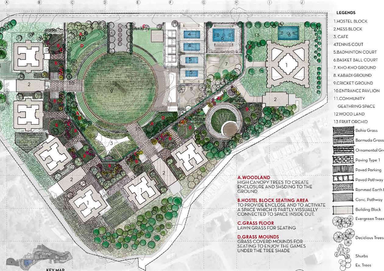 A key component of the landscape development plan for IISER Bhopal is the establishment of a state-of-the-art sports playfield that encourages physical activity, promotes wellness, and fosters a sense of community among students, faculty, and staff. The sports playfield will be designed to accommodate a range of sporting activities, including football, cricket, basketball, tennis, and athletics. It will feature well-maintained turf, modern sports infrastructure, and spectator seating to create an engaging and enjoyable experience for participants and spectators alike. The playfield will be strategically located within the campus, easily accessible from academic buildings and residential areas, to encourage regular physical exercise and a healthy lifestyle. Additionally, the design will incorporate sustainable features, such as rainwater harvesting systems and energy-efficient lighting, to minimize the environmental impact. The sports playfield will serve as a focal point for recreational and competitive sports, promoting team spirit, friendly competition, and a sense of camaraderie among the campus community. By providing a dedicated space for sports and physical activities, the landscape development plan aims to enhance the overall well-being of individuals and contribute to a vibrant campus environment.
