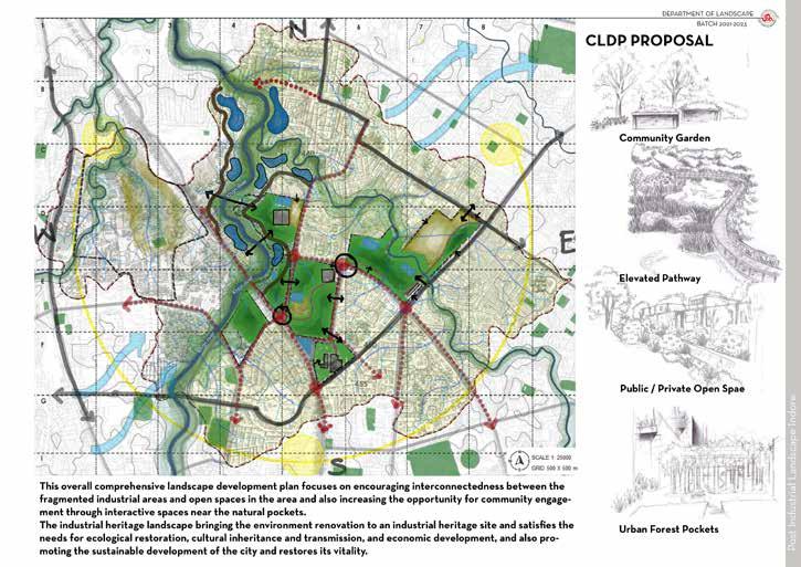overall well-being within an industrial setting. The plan emphasizes the strategic integration of vegetation throughout the site, including the use of native and adaptive plant species that are resilient to industrial conditions. The vegetation plan envisions a diverse range of green spaces, such as parks, gardens, and green corridors, which not only beautify the industrial landscape but also provide multiple benefits, such as air purification, noise reduction, and temperature moderation. Additionally, the CLDP promotes the inclusion of urban agriculture initiatives, such as rooftop gardens or vertical farming, which not only contribute to local food production but also enhance the ecological balance and social cohesion within the industrial environment.