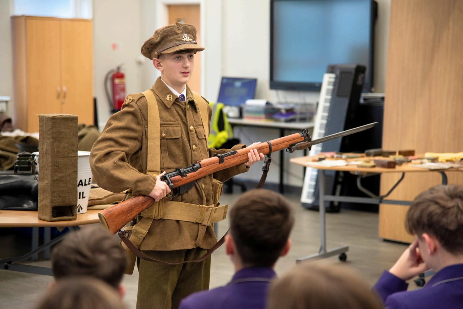 Golborne High was honoured to welcome historian Dr. Bill Smith, who brought history to life with the moving story of Edward Cain, a local hero who answered the call to serve in 1914. Students, who are currently studying the First World War in the enquiry 'Were the lions led by donkey's' were transported back in time as they learned about the tough conditions Edward and his fellow soldiers faced on the front lines, leading up to his disappearance at Beaumont-Hamel on July 1st, 1916, during the Battle of the Somme. Students also enjoyed a hands-on experience with genuine battlefield artifacts, even trying on original First World War uniforms—bringing history vividly to life. The workshop is a powerful reminder of the courage and sacrifice of those who came before us and offered a deeper, more meaningful understanding of the First World War and its legacy.