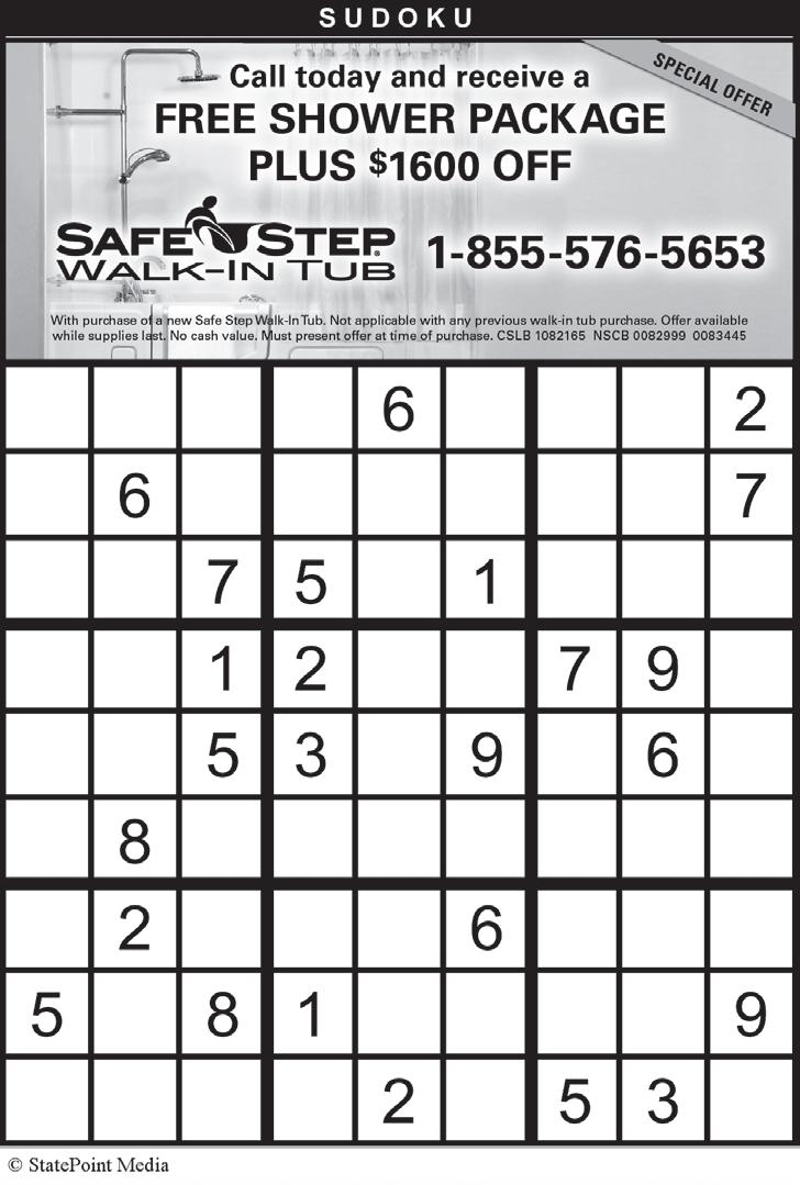 i / 606E Broadway Goldendale 773-5000 Visit TheSentinel Tires LESSCHWAB at www.GoldendaleSentinel.com ACROSS DOWN 37)Candidate'sassistant 38)Remain unspoiled 9) Twocupsthatdon'tmakea 39)Dispossess 40)Wide-eyedgaze 41)Inanadvancedstageof pregnancy 43)Gasstation option 44)Pair preserver 45)Singinginsect-eater 46)Phonysort 49)Animal withacub 50)Longtimefollower? 53)Stateconfidently 54)Chatter 57)Saltsondeck 58)Clock parts 59)Wordina NewYear'ssong title 60)Ferrell holidayfilm 61)Breedofterrier 62)They'remadedaily 1) Oven setting 5) Oneofthreebears 1) Typesetforemphasis 2) All firedup 3) Fulfilled,asa promise 4) Makea mistake 5) Identified,asa face 6) Onelendinga helpinghand essentially 7) Rendered asacompliment 8) ShakersfounderLee 9) Regularboyfriend 10)Summonedstaff,perhaps 11)Loopedcross 14)Eternallyyoung 15)Intimidated 17)A-frameoverhangs 22)Bobbleheadsdoit 23)Startlingrevelations 24)Surroundandattack 25)Mirrors'partner 26)Eucharistplate 27)San DiegoStateplayer 28)Choiceonsometests 29)Phony handle 30)Nucleusoftrainedpersonnel 31)Genuflect 33)Down ona map 36)Sovereign 40)FlistoricTuscancity 42)Repayment reminder 43)Flirt withsleep 45)Chicagoadjective 46)Chopped horsd'oeuvre 47) Racetrackconfiguration 48)Fieldworkerofyore 49)Chainsegment 50)A malarial fever 51) Neuter asamale horse 52)Unlikelywinnersdefythem 55)Isnt lacking 56)Blarney-stonekisser'sgift pint 12)Recovered from,asacold 13)Forest vine 15)Coffeesource 16)Seeingwhatissaid 18)Putinorderofsignificance 19)Pesticidebanned bythe EPA 5Like ^ TheSentinel onFacebookE 20)Morethan passed thetest 21)Sufficient 23)" 24)Sudden bitof bad news 25)Fixed,inaway 28)Annoyingmikeeffect 32)Somechallengingpuzzles 33)Verbalfeistiness 34)Greatflair 35)Palindromicmalename 36)Spymastersconcerns after" SUDOKU Calltoday and receivea FREE SHOWER PACKAGE * PLUS$1600OFF SAFE^WS By CarlCranby WAUK- V,75E 1-855-576-5653 5 6 7 8 9 10 11 *r it Safe StepWa sst No cash value M With purchase while suppliesI Ik-InTub Not applicable withany previous walk-intubpurchase Offer available ust present offer at time of purchase CSLB 1082165 NSCB 0082999 0083445 13 14 15 18 2 6 21 22 6 7 24 1 7 5 28 32 33 34 1 2 9 7 35 36 37 5 3 9 6 38 39 40 41 42 8 44 2 6 19 1 5 8 9 53 54 55 58 57 FreeDailyCrosswords Copyright©FreeDailyCrosswordscom EditedbyTimothyParker 2 3 5 60 61 ©StatePointMedia
