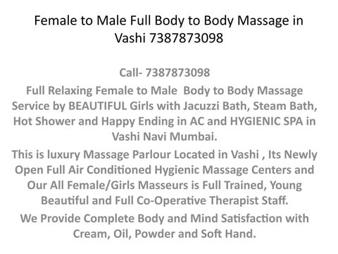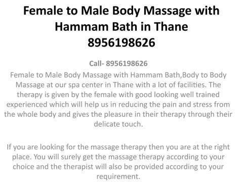 Female to Male Body Massage with Hammam Bath,Body to Body Massage at our spa center in Thane with a lot of facilities. The therapy is given by the female with good looking well trained experienced which will help us in reducing the pain and stress from the whole body and gives the pleasure in their therapy through their delicate touch. If you are looking for the massage therapy then you are at the right place. You will surely get the massage therapy according to your choice and the therapist will also be provided according to your requirement.