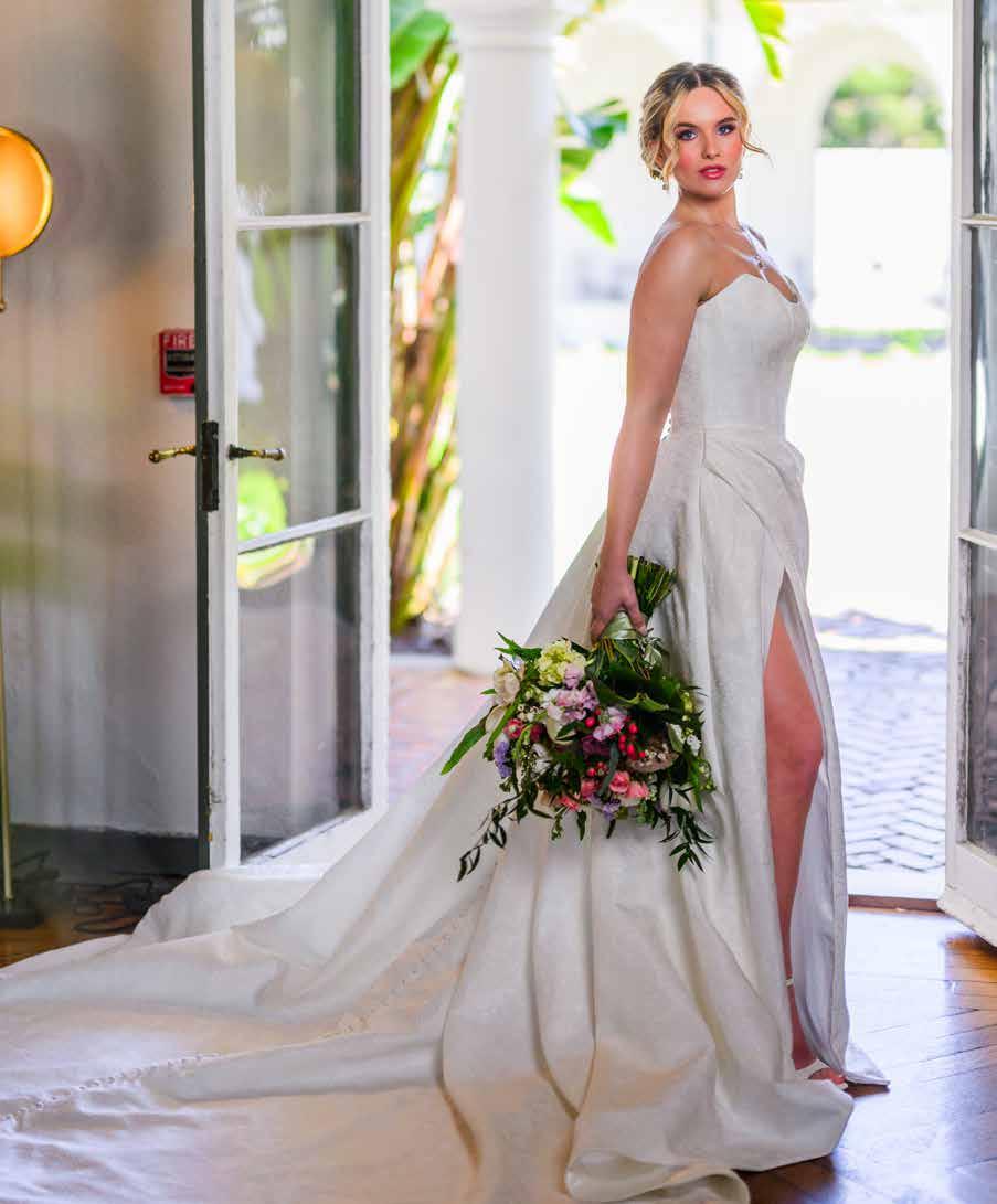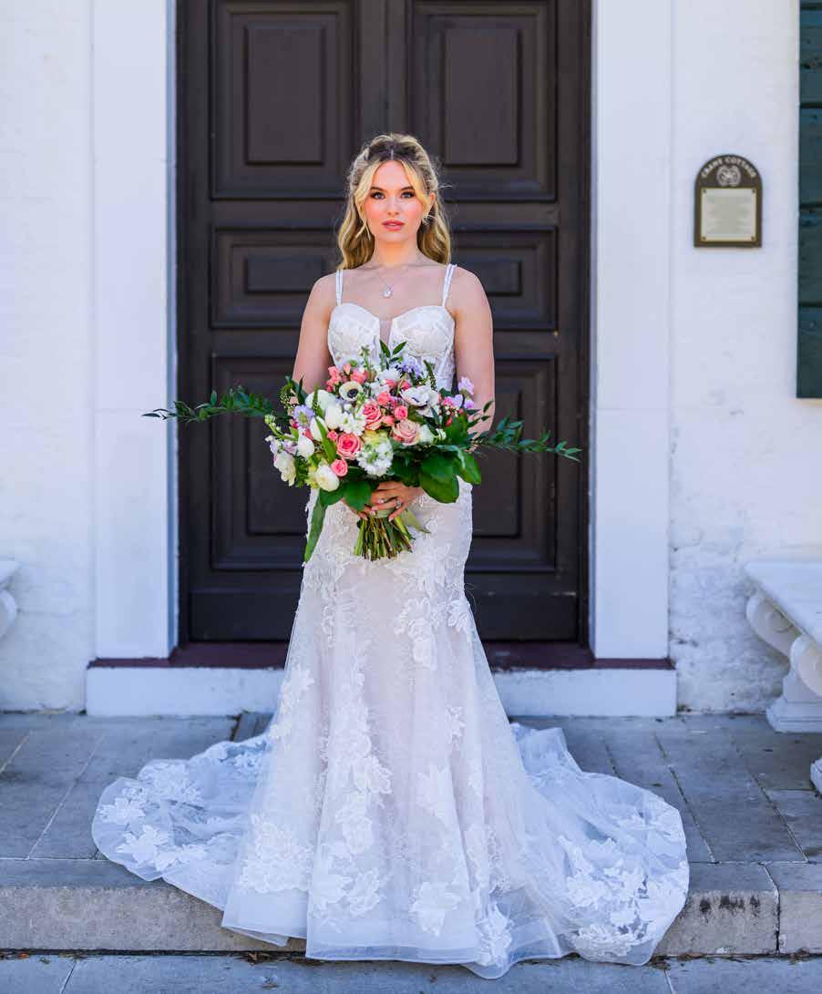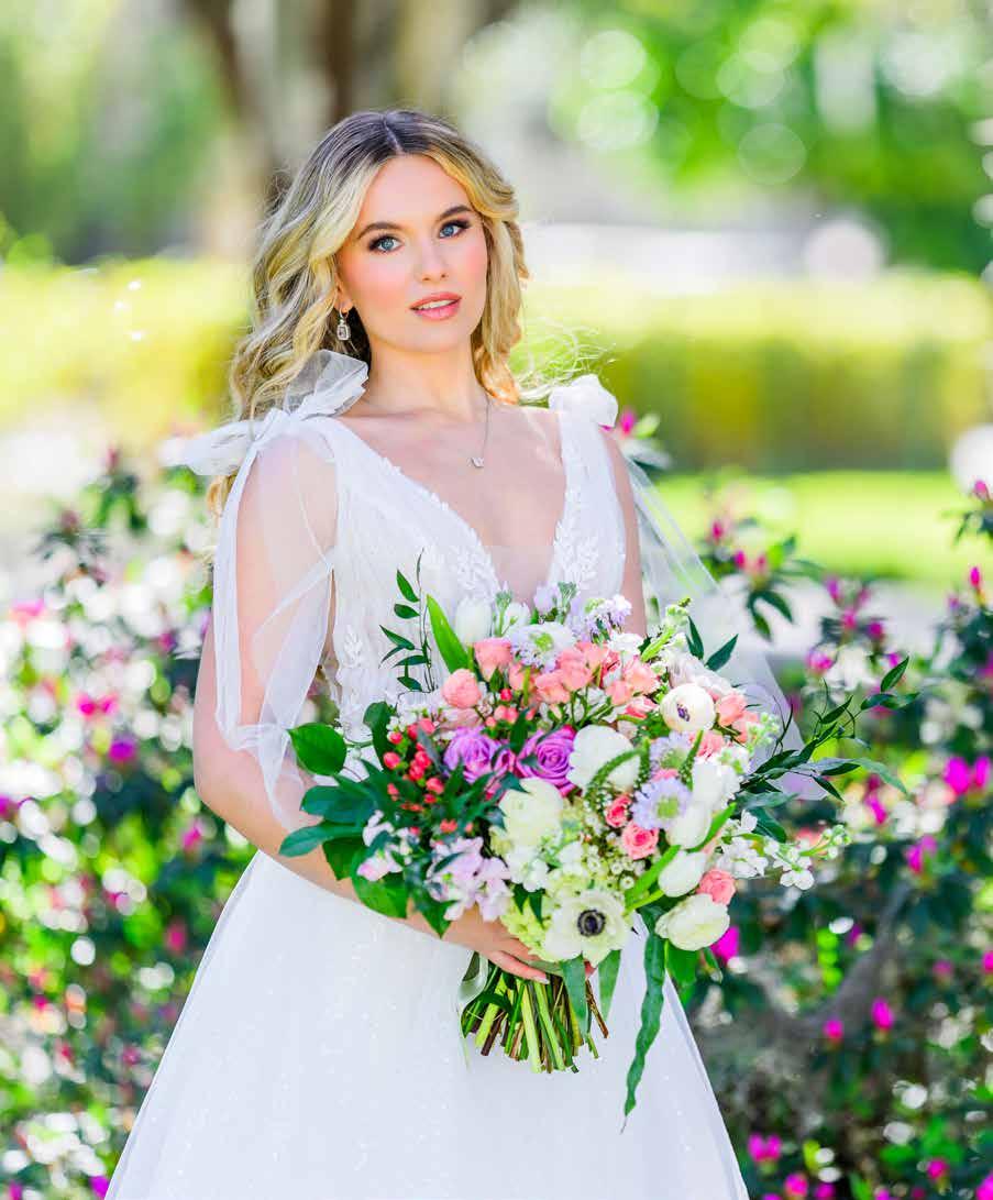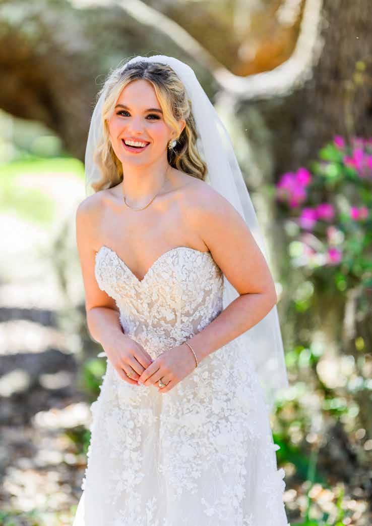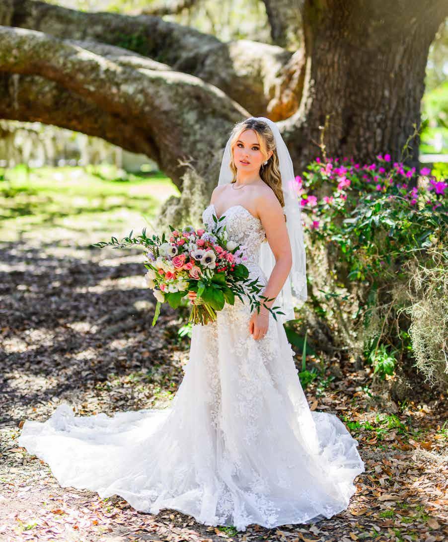 The stunning Mary Kate Hendley stands amid blooming azaleas near Crane Cottage on Jekyll Island. She’s wearing a gown from Southern Posh Couture in Baxley and is carrying a bouquet by Edward’s on St. Simons. Her jewelry is from Cunningham’s Jewelers in Brunswick. She was photographed by John Krivec.