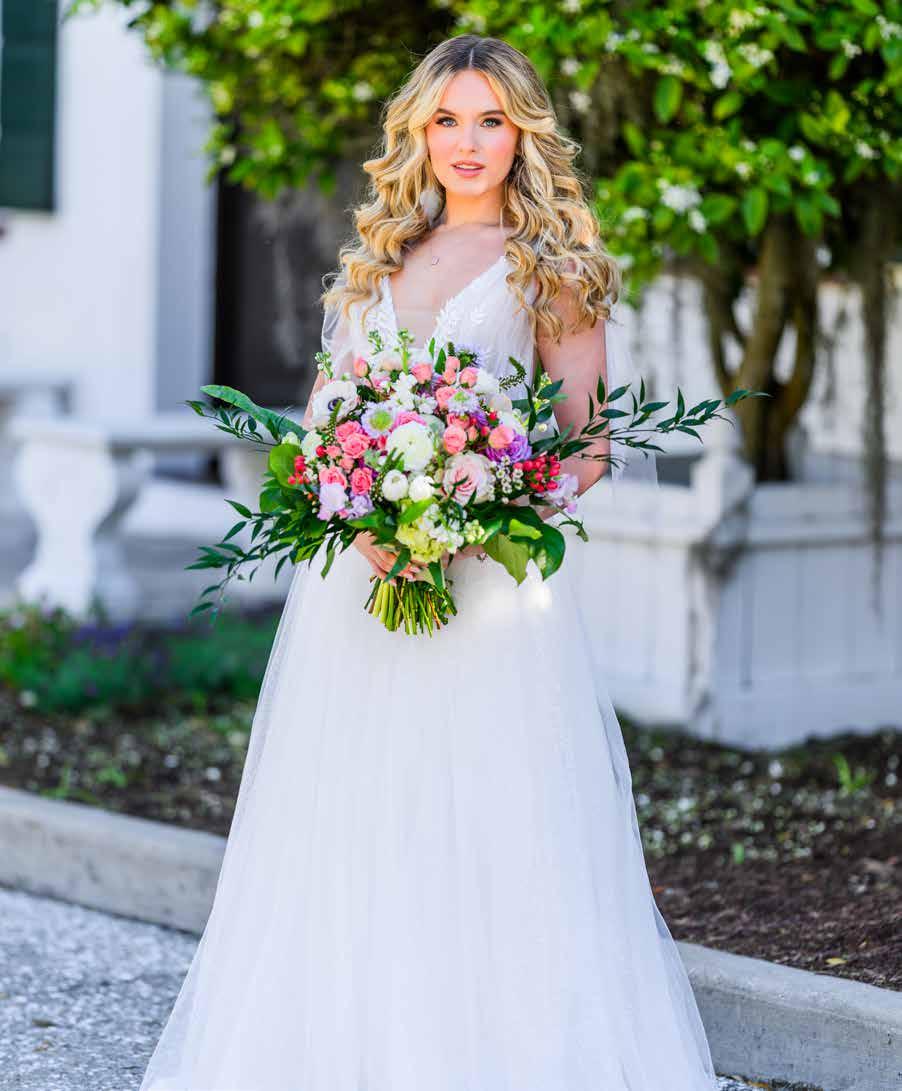 This year’s bridal shoot, Pastel Perfection, was set at the historic Crane Cottage on Jekyll Island. Our stunning model, Mary Kate Hendley, was styled in feminine pastel makeup and carried similar colors in her bouquet.