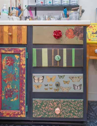 “I do everything from a high gloss finish to chippy, crackly finishes. You can add embellishments, such as stencils or these decals. I use anything and everything,” she says, holding up a strip.