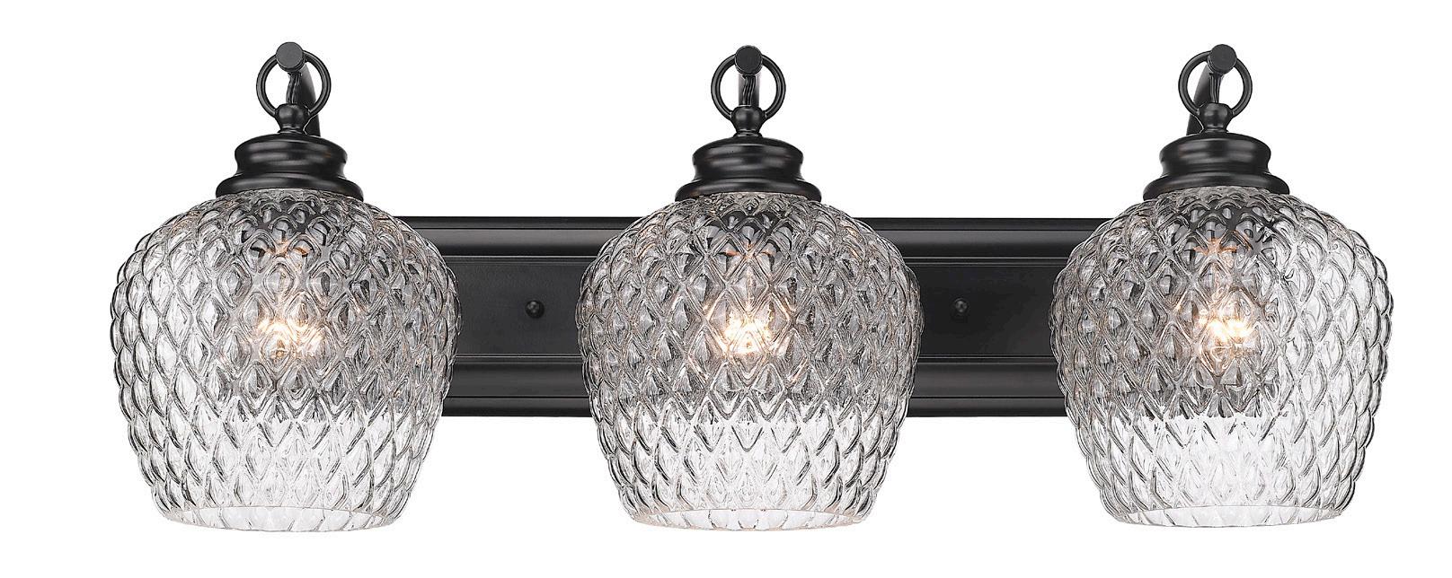 Retro with a flirty flair, Adeline is ideal for eclectic spaces. The transitional fixtures are feminine with a vintage look and organic form. The embossed diamond-cut lattice pattern of the clear, curved glass refracts light and adds visual interest. Open bottom shades create task lighting and allow for easy bulb changes.