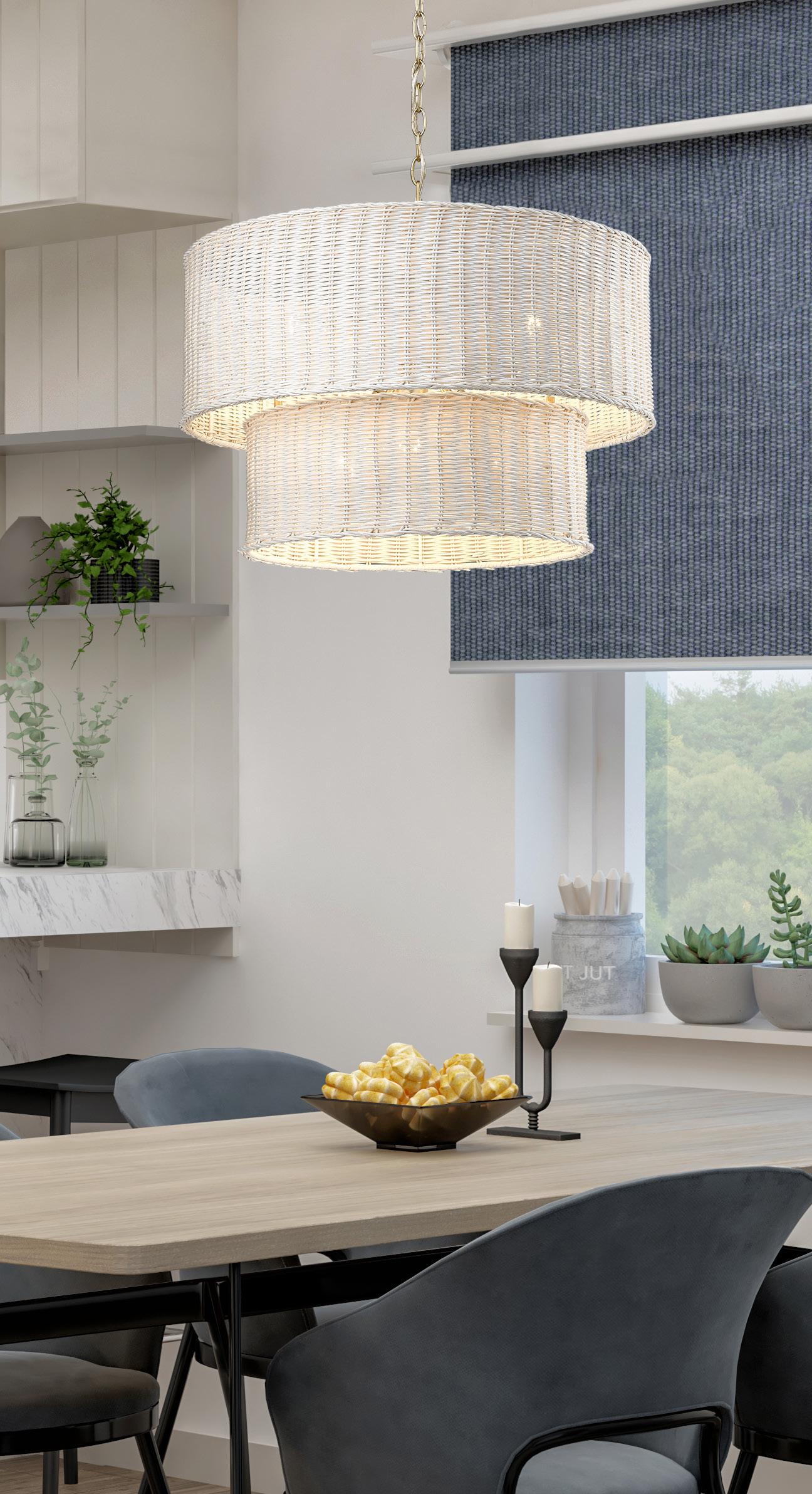 Casual elegance is re-defined in the transitional Erma Collection. This Bohemian-chic series will give your home new life. Offered in multiple silhouettes and finishes, including some two-tier configurations, these textured, airy fixtures are stunning. Carefully crafted of woven wicker over a steel frame, the lights are durable. Create a warm ambiance in any indoor space with these peek-a-boo woven shades. The Brushed Champagne Bronze and White Wicker have an upscale look.