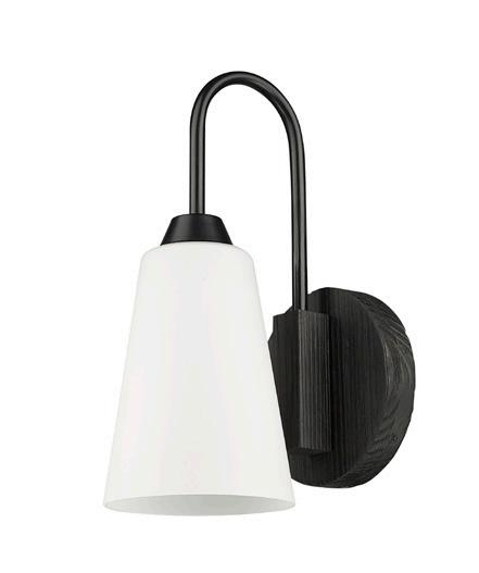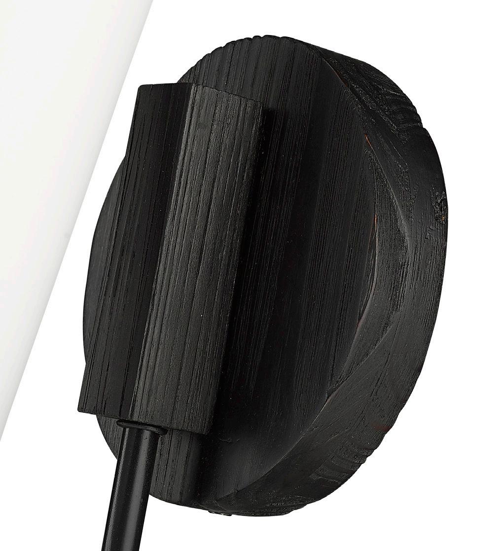 Clean and sleek, in classic black and white, the Neela sconce is suitable for transitional to modern interiors. The sconce has a simple form that is composed of mixed materials. The thickly-grained wooden backplate features a dark ebony stain. A conical opal glass shade is supported by a sleek, steel arm finished in matte black. Approved for damp locations, the light may be mounted anywhere in the home and positioned with the glass facing up or down.