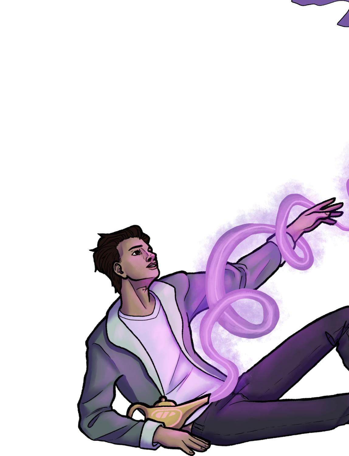 The man salvaged this item from the scrap yard and brought it home with him. He found a perfect place to display the beautiful decorative item, and it fit perfectly in his living room. One day, the lamp had become dusty. The man took a rag and some cleaning spray and went to clean the lamp, hoping to restore its resplendent golden aura that dazzled his house guests. While rubbing the lamp with his rag, a strange purple smoke began to seep out of the lamp. The smoke clouded the man’s vision and it continued to pour out of the golden lamp. The smoke gathered on the floor, coating the ground in a mesmerizing purple haze. The smoke began to swirl and mix together, forming a smoky entity. As the clouds of brilliant haze cleared, a great genie appeared before the man.