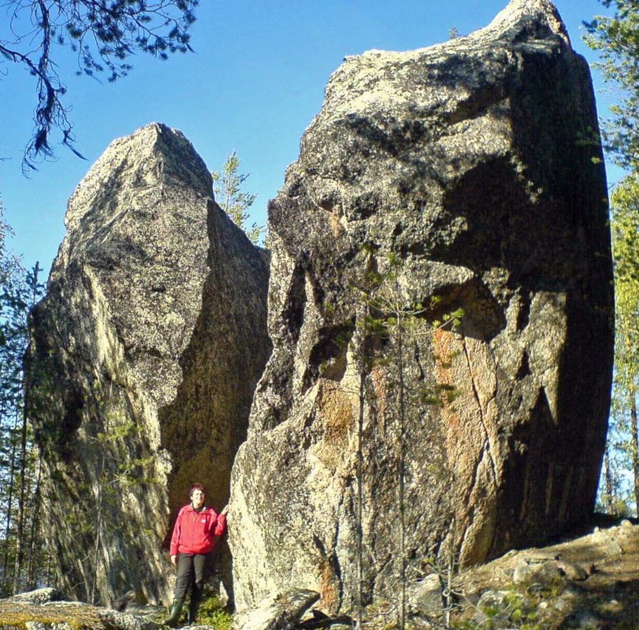 The large stone has likely ended up in this place due to the thick layer of ice that once covered the area. Old tales, however tells the story about giants carrying the stone, placing it here and cutting it in half. You can read more, both factual and fictional, about the stone once you are there.