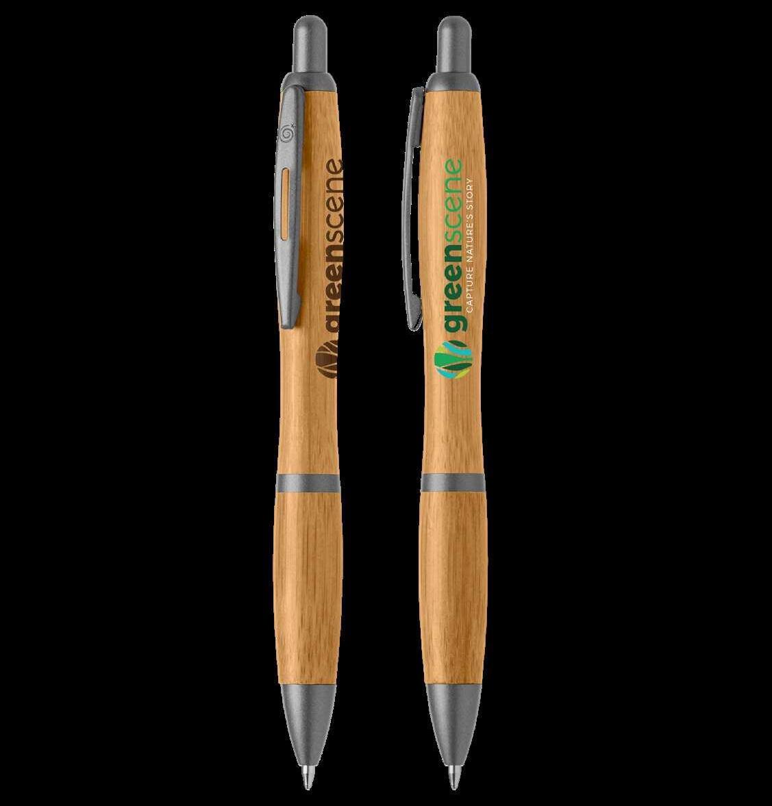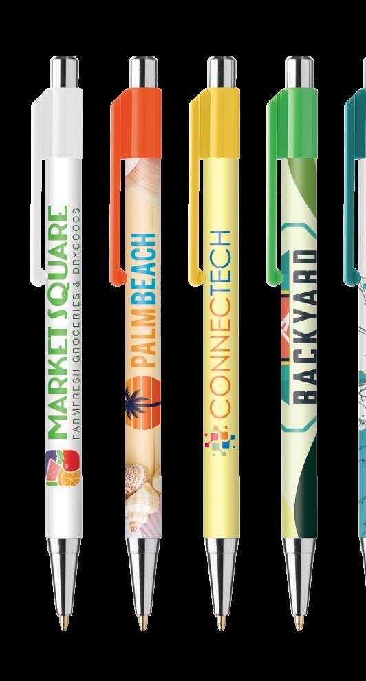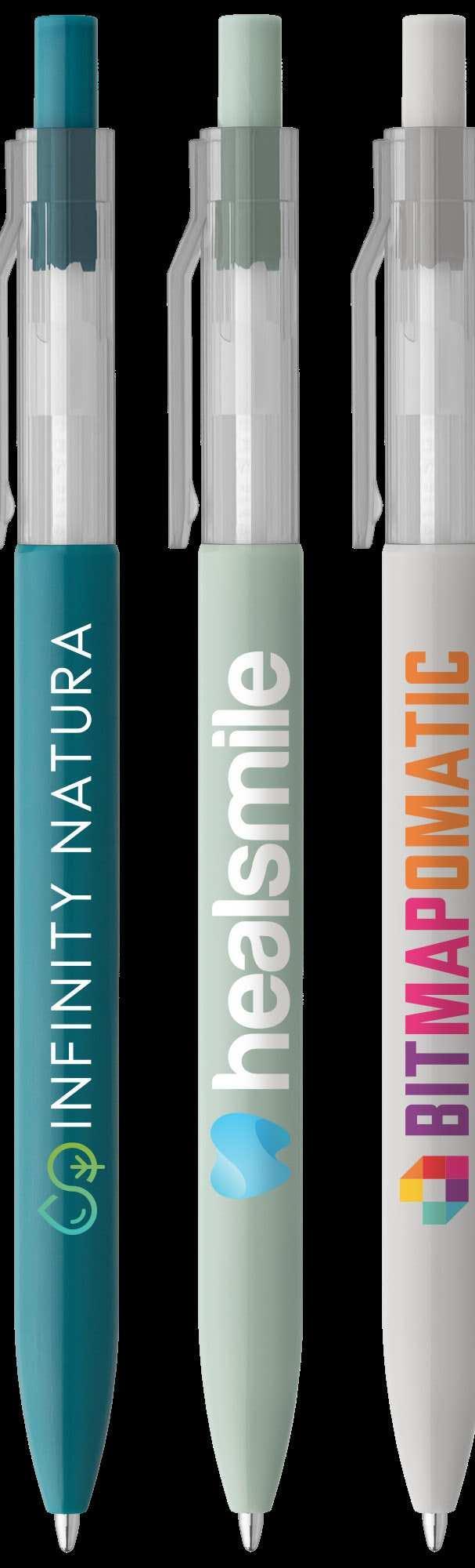 Recycled Plastic Pen • Deco Methods: Silkscreen, 2.0"w x .5"h Full Color Inkjet, 2.28" w x .276"h • MOQ: 300 • Production: As quickly as 5 days • As low as $0.70 (c)