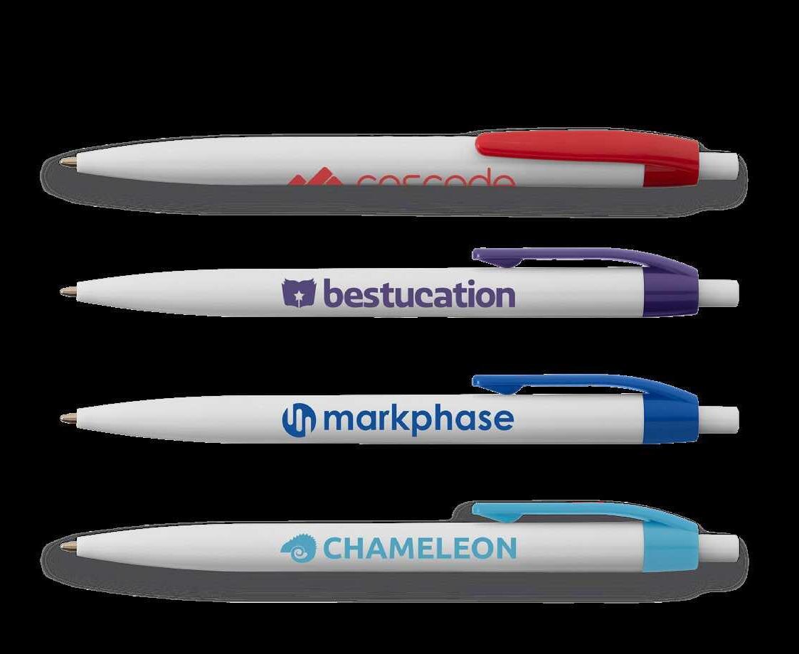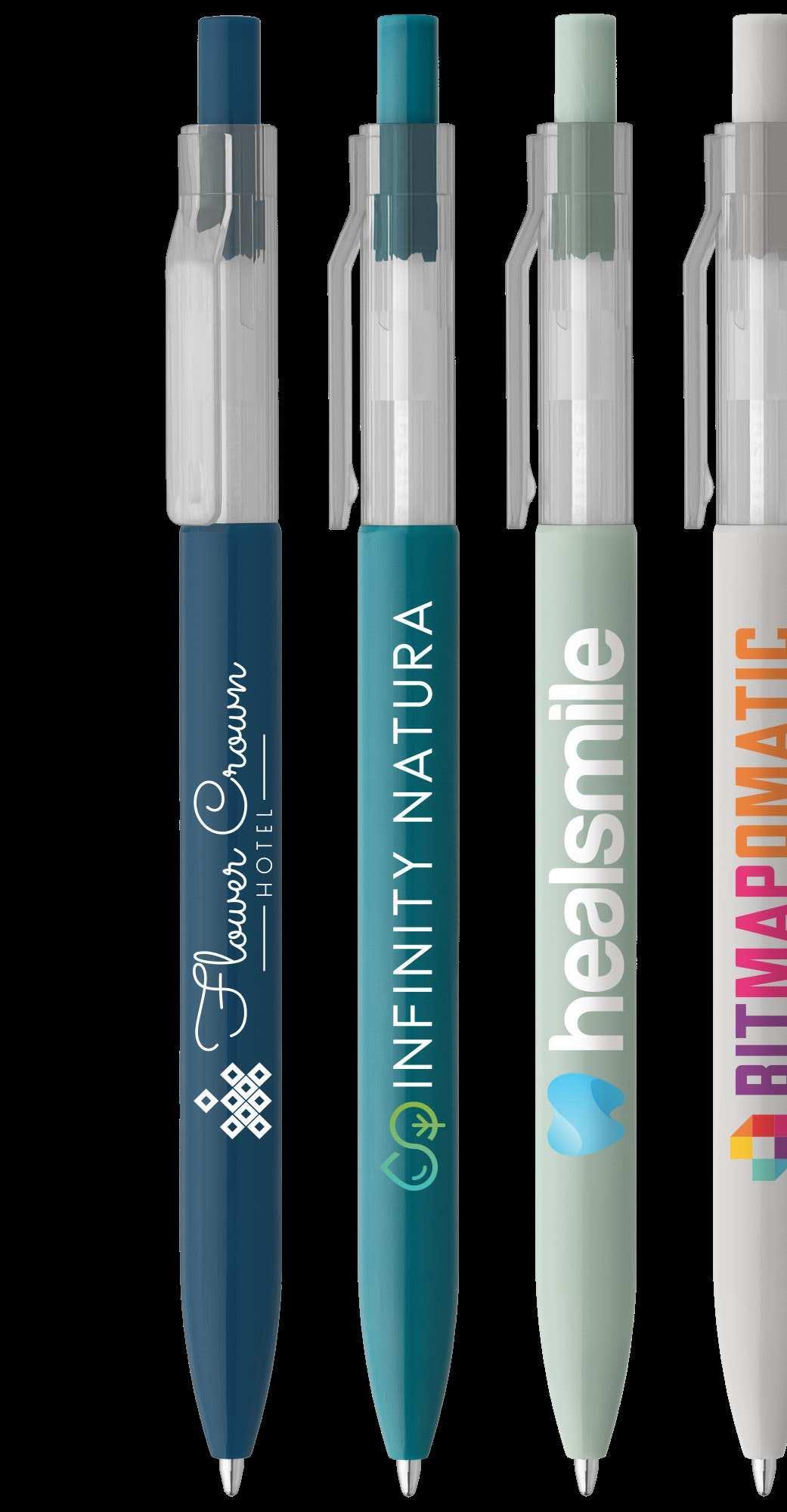 Recycled Plastic Curvy Pen • Deco Methods: Silkscreen, 1.5"w x .6"h | Full Color Inkjet, 1.5"w x .276"h • MOQ: 300 • Production: As quickly as 5 days • As low as $1.41 (c)