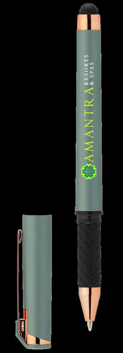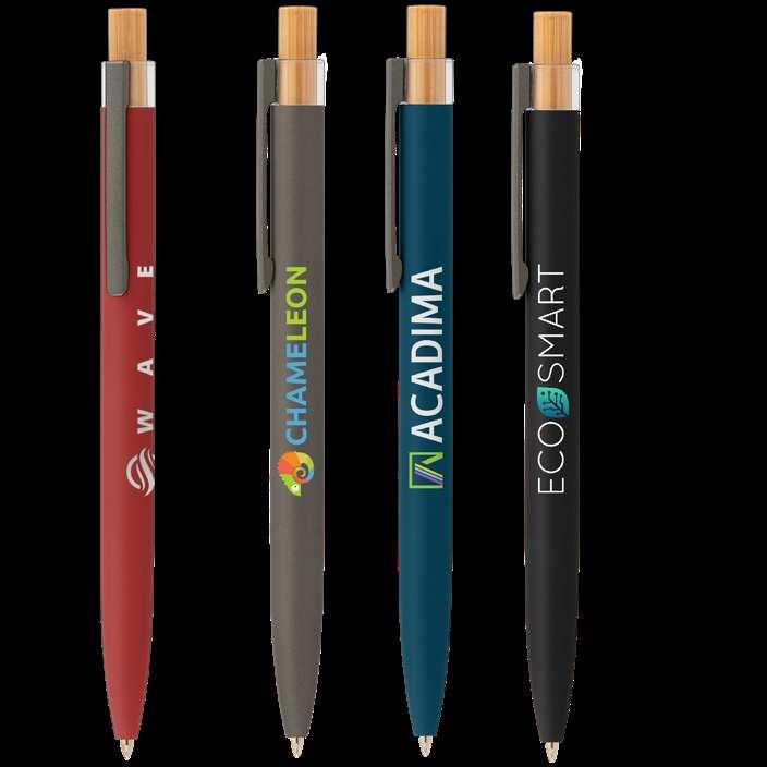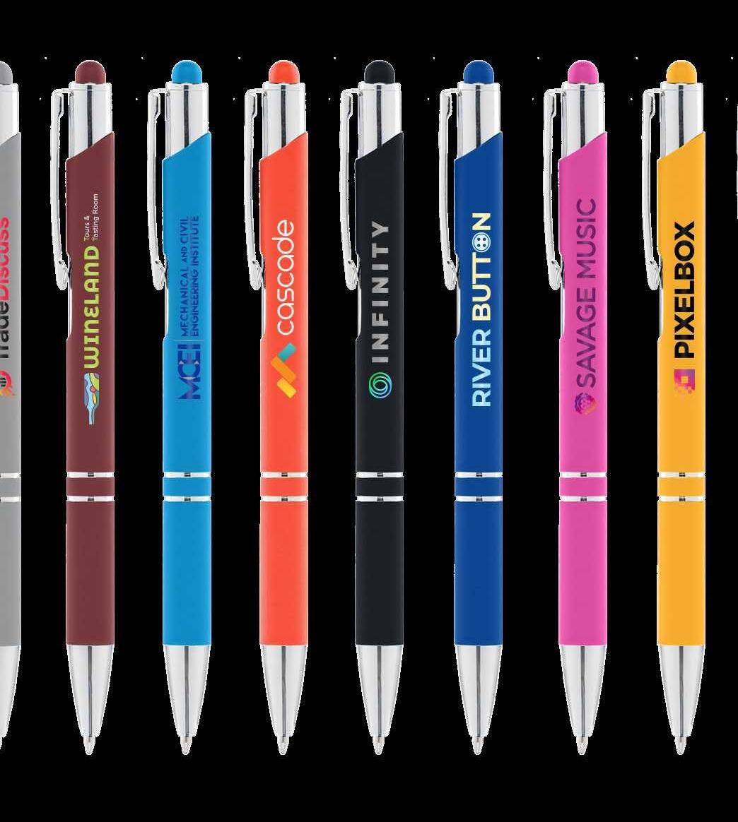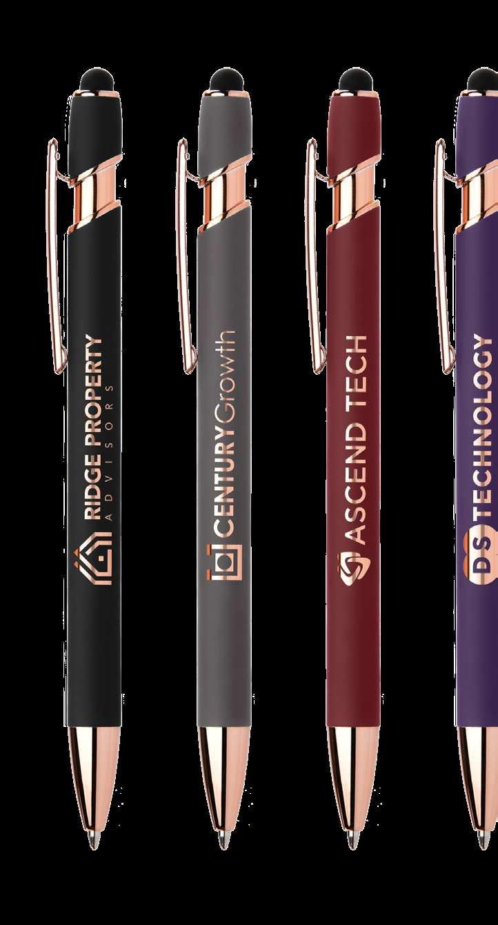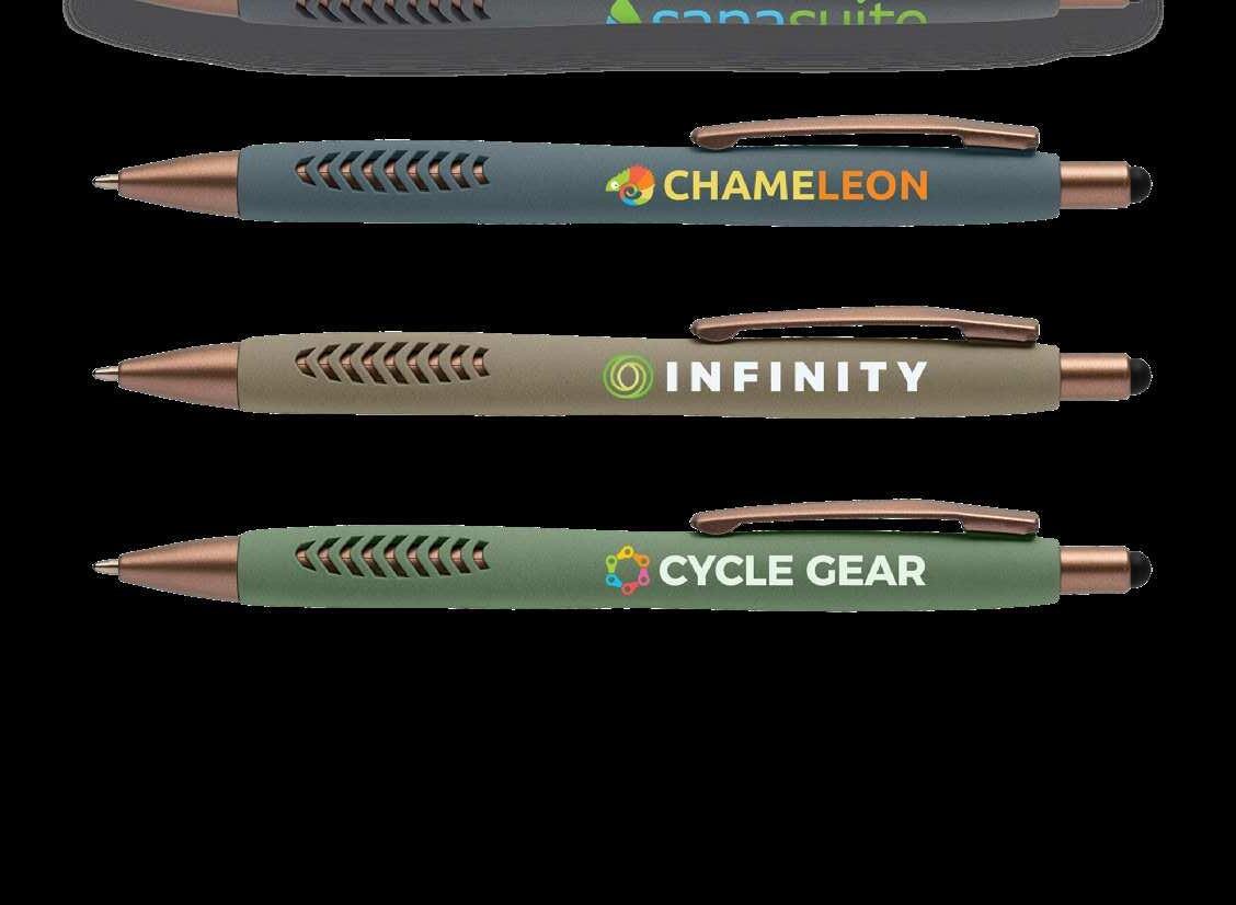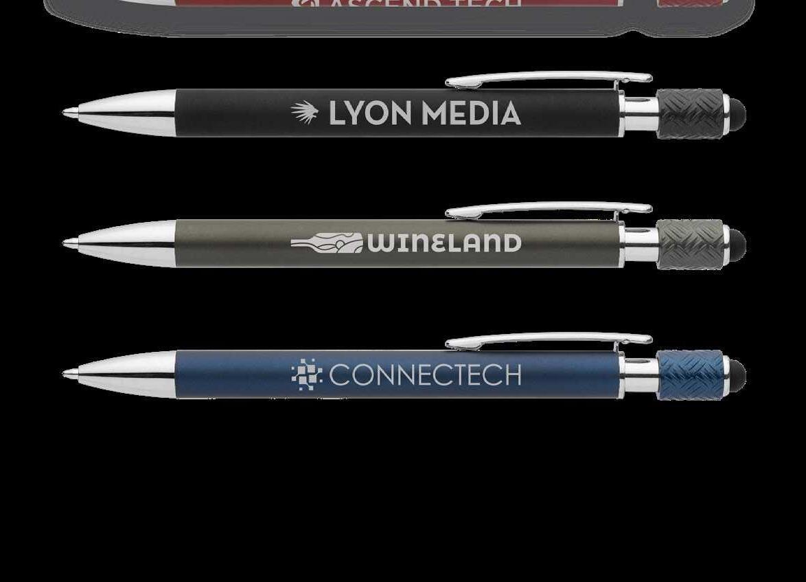 Softy Recycled Aluminum Pen w/Stylus • Deco Methods: Laser, 2"w x .295"h | Full Color Inkjet, 2.283"w x .276"h • MOQ: 100 Production: As quickly as 4 days • As low as $1.95 (c)
