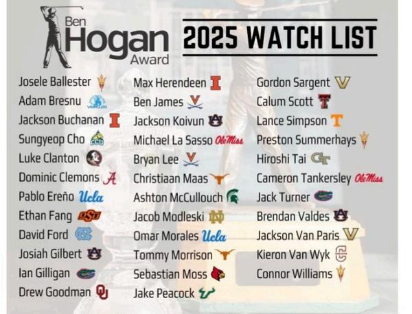 A total of thirty-five of the nation's most distinguished collegiate golfers have been selected for the watch list for the 2025 Ben Hogan Award. This announcement was jointly issued by the Hogan Trophy Award Foundation, the Friends of Golf (FOG), and the Golf Coaches Association of America (GCAA). The watch list for the 2025 Ben Hogan Award, as established by the award's subcommittee, features the following golfers: Josele Ballester (Arizona State), Adam Bresnu (Odessa), Jackson Buchanan (Illinois), Sungyeop Cho (Colorado Christian), Luke Clanton (Florida State), Dominic Clemons (Alabama), Pablo Ereño (UCLA), Ethan Fang (Oklahoma State), David Ford (North Carolina), Josiah Gilbert (Auburn), Ian Gilligan (Florida), Drew Goodman (Oklahoma), Max Herendeen (Illinois), Ben James (Virginia), Jackson Koivun (Auburn), Michael La Sasso (Ole Miss), Bryan Lee (Virginia), Christiaan Maas (Texas), Ashton McCullouch (Michigan State), Jacob Modleski (Notre Dame), Omar Morales (UCLA), Tommy Morrison (Texas), Sebastian Moss (Louisville), Jake Peacock (USF), Gordon Sargent (Vanderbilt), Calum Scott (Texas Tech), Lance Simpson (Tennessee), Preston Summerhays (Arizona State), Hiroshi Tai (Georgia Tech), Cameron Tankersley (Ole Miss), Jack Turner (Florida), Brendan Valdes (Auburn), Jackson Van Paris (Vanderbilt), Kieron Van Wyk (Charleston), and Connor Williams (Arizona State).