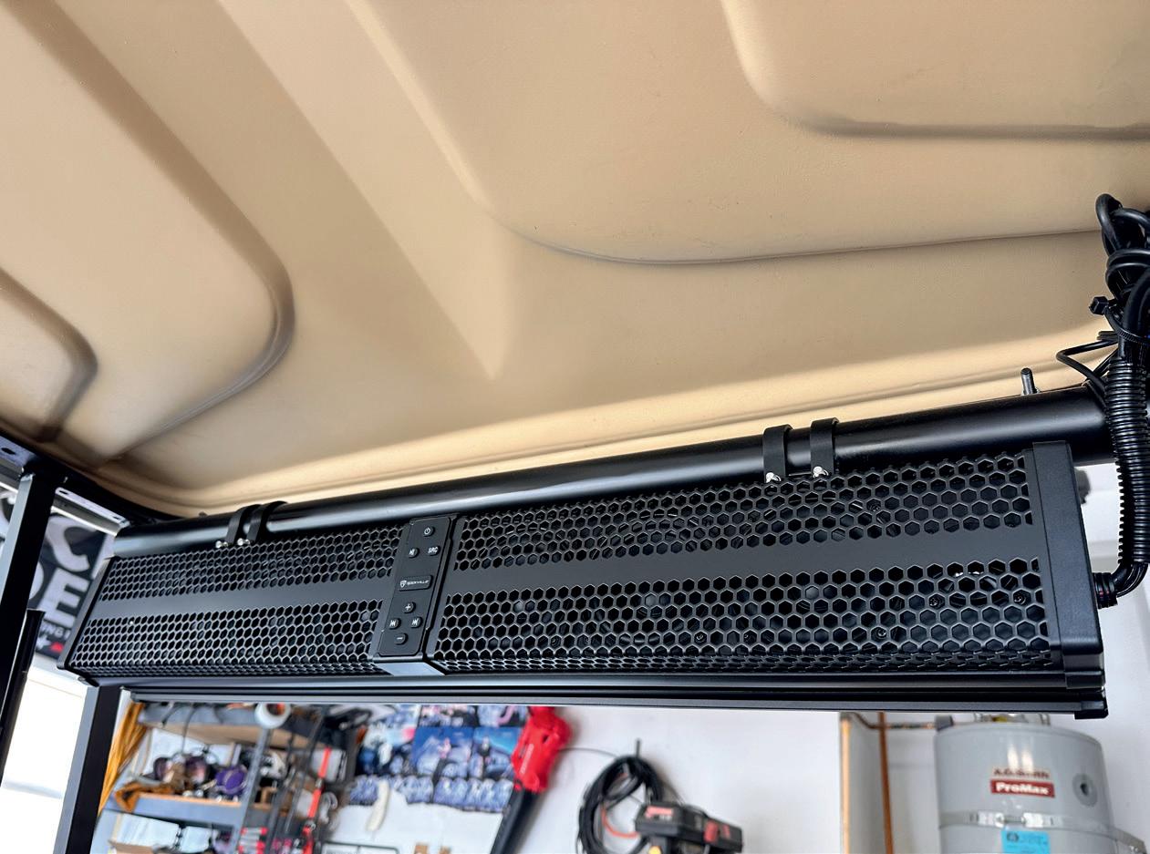 Interior comforts include a custom pod built to accommodate the larger TXT seat, a 12-inch Rockville bass tube with its own amplifier, and a sound bar in the rear. All cables are neatly routed through the factory housing for a clean installation. The standard aftermarket EZGO TXT dash with carbon fiber appearance was retained for simplicity, featuring air gauges, battery meter, and forward/reverse switches.