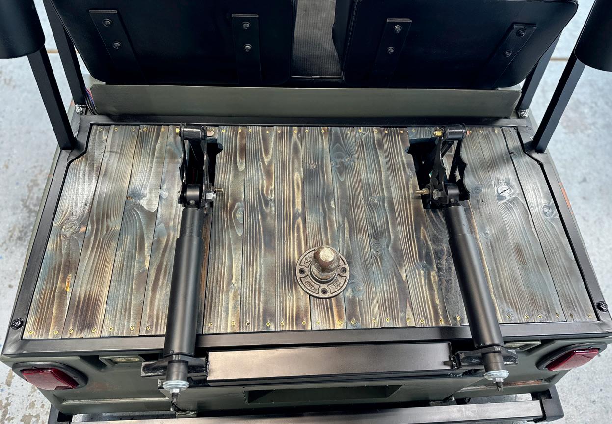 The cart's distinctive patina finish didn't happen by accident. "I just went down the YouTube wormhole, kind of figured out how to make patina," Townsend says of the army green base with satin clear coat. This weathered look complements the classic front end without requiring the expense of a full custom paint job.