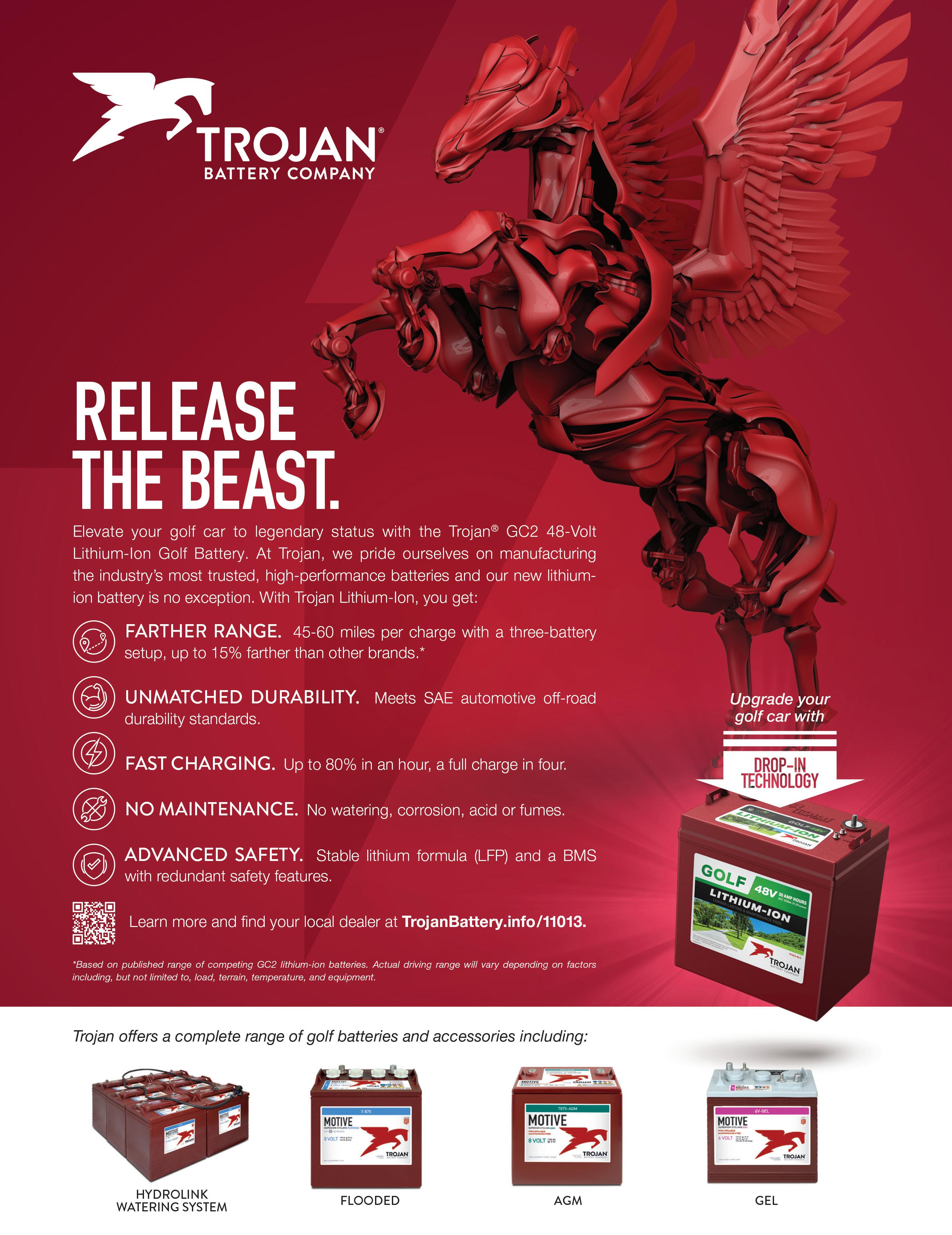 T• Does not rely solely on the cell provider’s UL listing. Make sure the entire battery pack is UL-certified. Don’t make the mistake of buying a lithium-ion battery on price alone. Select a reputable manufacturer with U.S.-based support and do your due diligence. What Sets Trojan Battery Company Apart from Other Manufacturers? At Trojan, we bring nearly 100 years of battery manufacturing experience, including 10 years of lithium-ion experience, to every battery we manufacture. We pioneered the golf car battery in 1952 and have been a trusted partner to major golf car OEMs. Our deep infrastructure lets us deliver superior customer service and support. And our maroon-colored batteries are renowned around the world for their reliability, durability, and longevity.