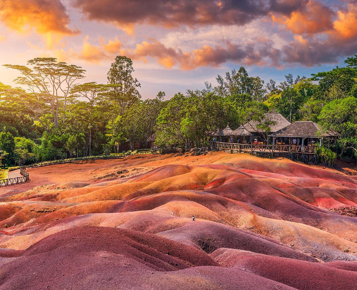 Discover the Seven Coloured Earths in Chamarel: Witness this geological wonder, a spectacle of multicoloured terrain, as well as giant turtles and a stunning waterfall.
